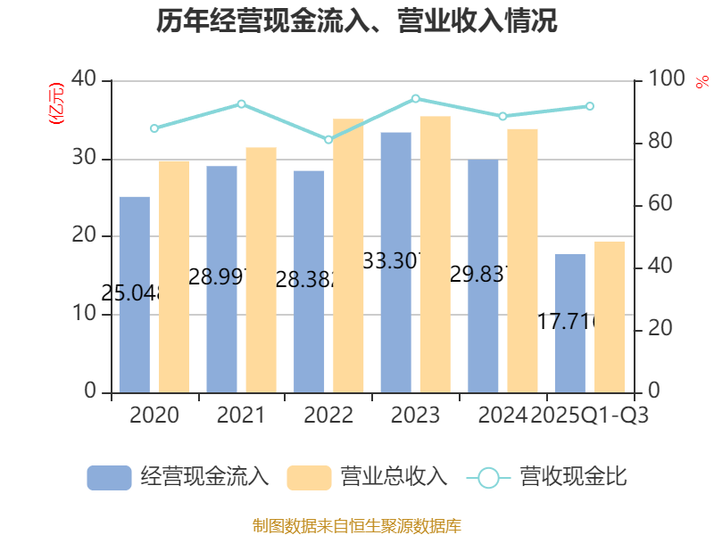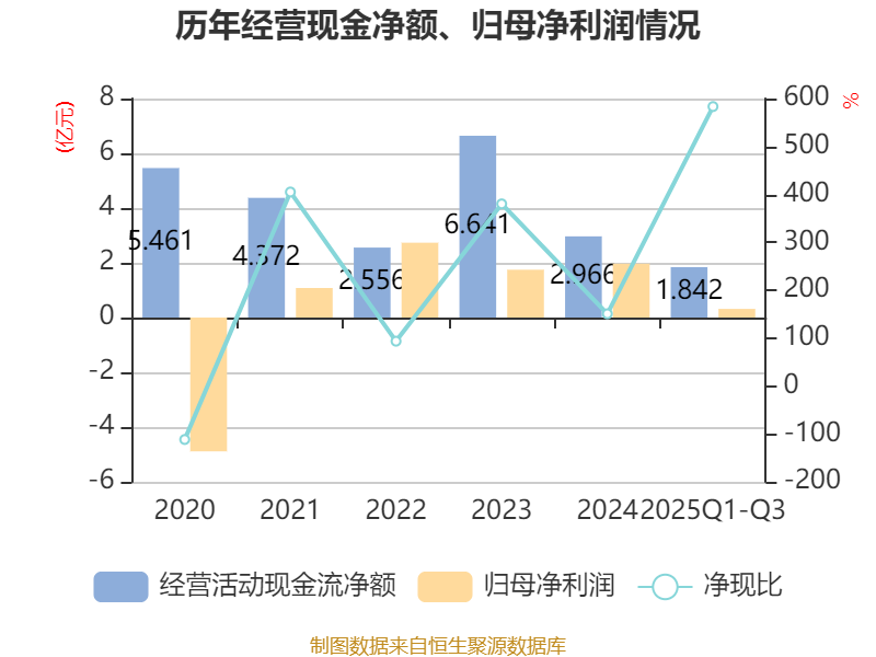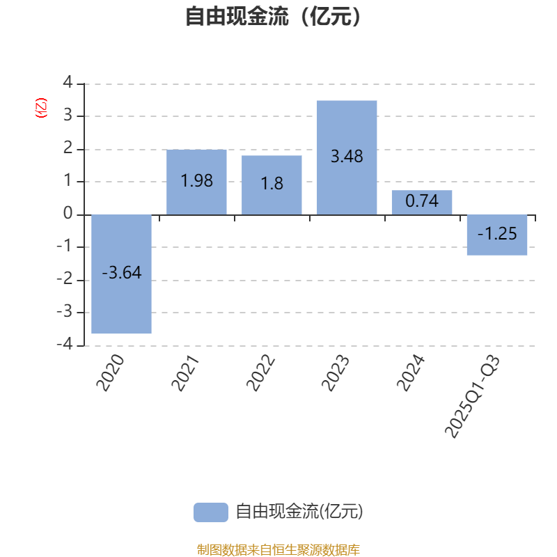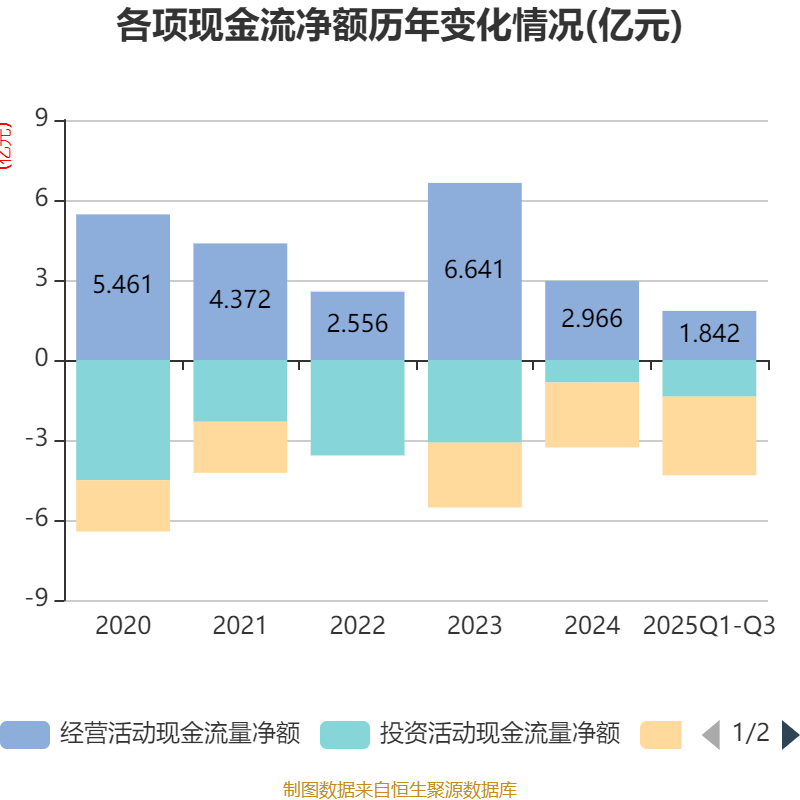 2025年前三季度,公司经营活动现金流净额为1.84亿元,同比下降8.57%;筹资活动现金流净额-2.95亿元,同比减少1.39亿元;投资活动现金流净额-1.37亿元,上年同期为-1.07亿元。
