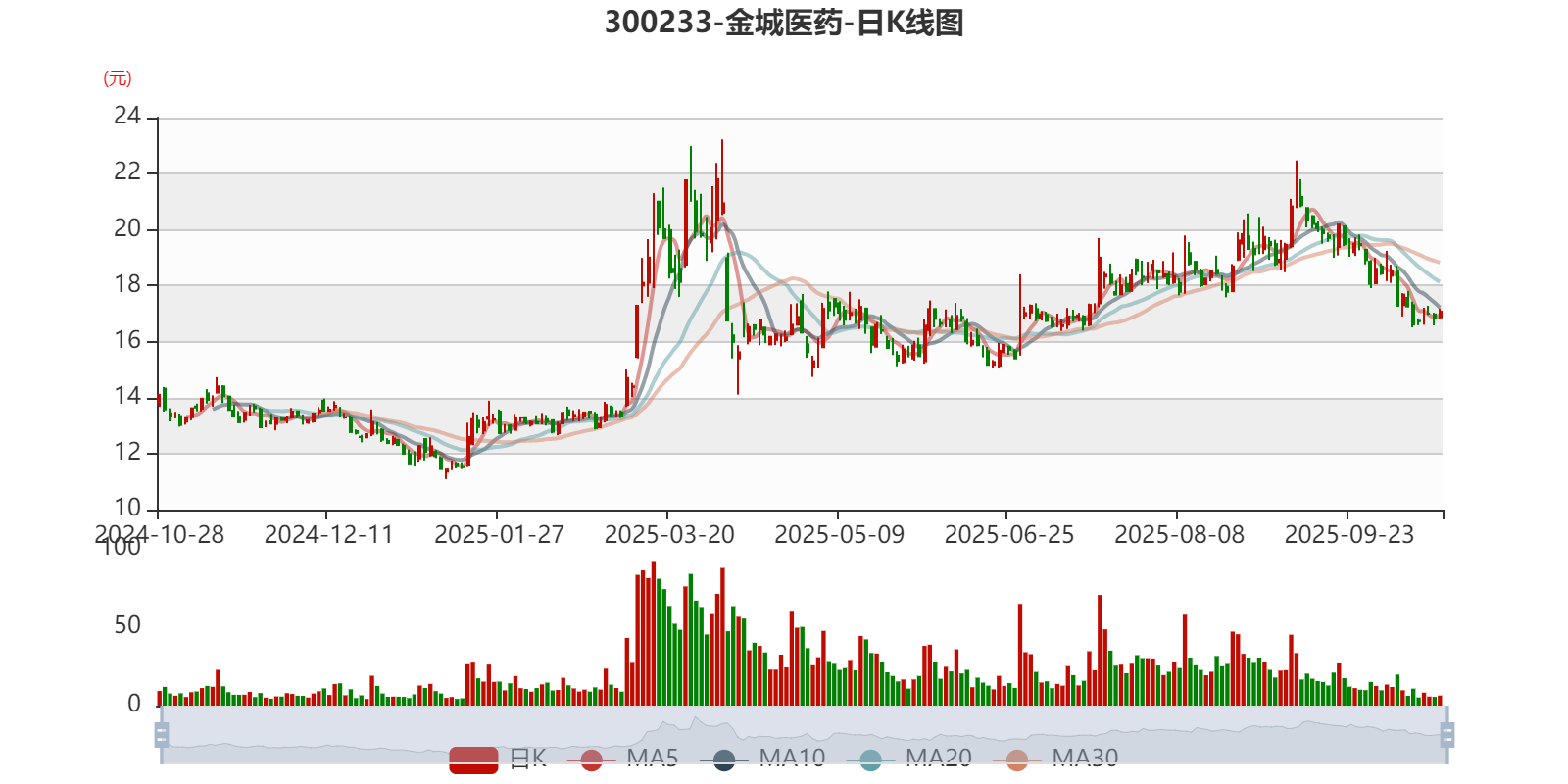 中证智能财讯金城医药(300233)10月27日披露2025年第三季度报告。前三季度公司实现营业总收入19.32亿元,同比下降23.19%;归母净利润3157.71万元,同比下降79.10%;扣非净利润2190.98万元,同比下降84.16%;经营活动产生的现金流量净额为1.84亿元,同比下降8.57%;报告期内,金城医药基本每股收益为0.08元,加权平均净资产收益率为0.85%。