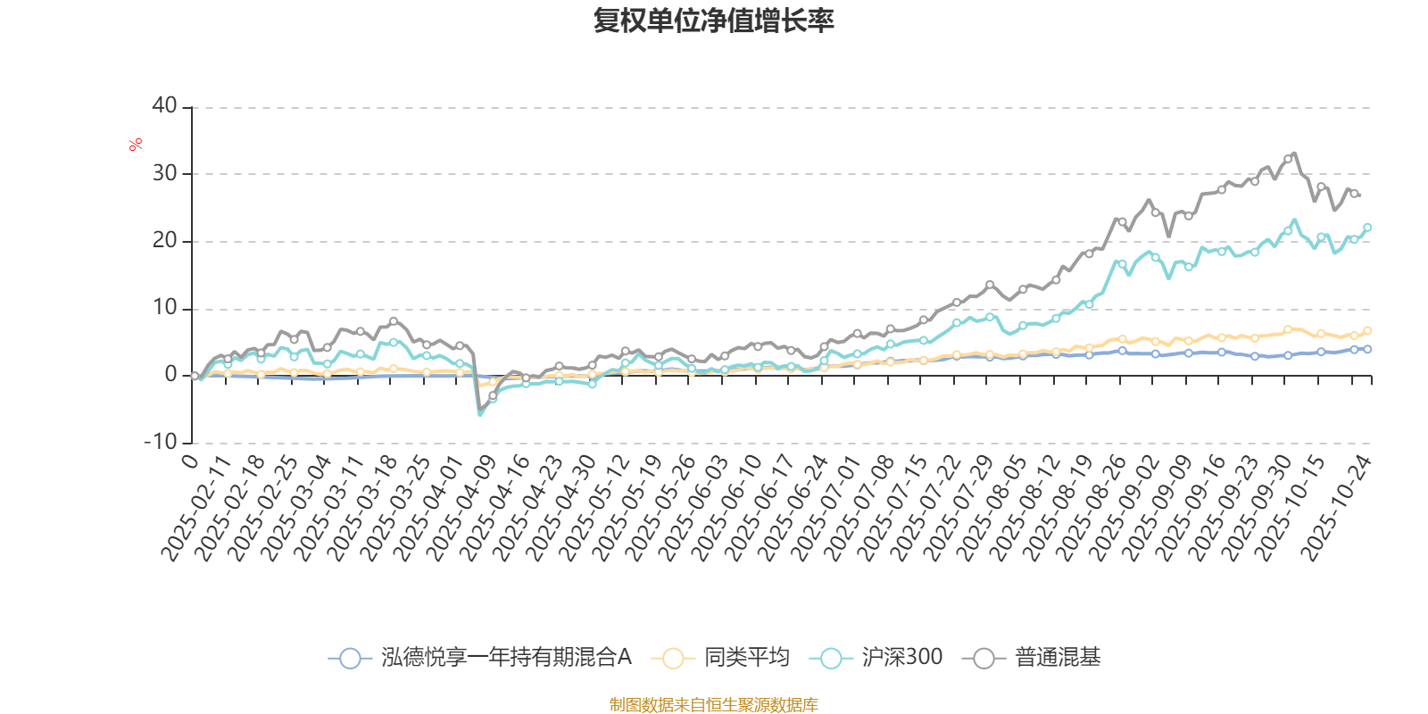 截至10月24日,泓德悦享一年持有期混合A近三个月复权单位净值增长率为1.02%,位于同类可比基金467/629;近半年复权单位净值增长率为4.15%,位于同类可比基金392/629。