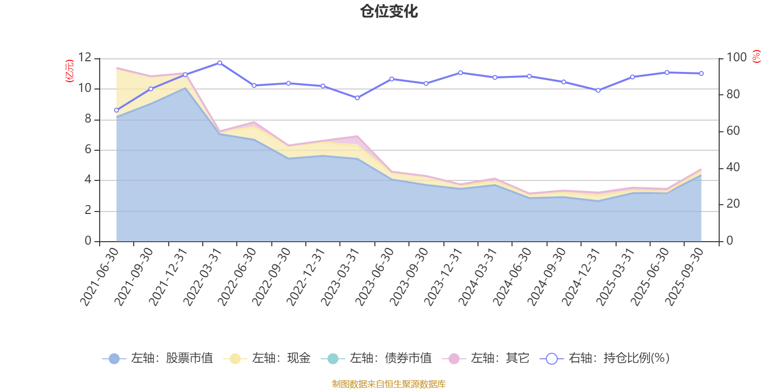 据定期报告数据统计,近三年平均股票仓位为87.81%,同类平均为85.47%。2022年一季度末基金达到97.54%的最高仓位,2021年上半年末最低,为71.68%。