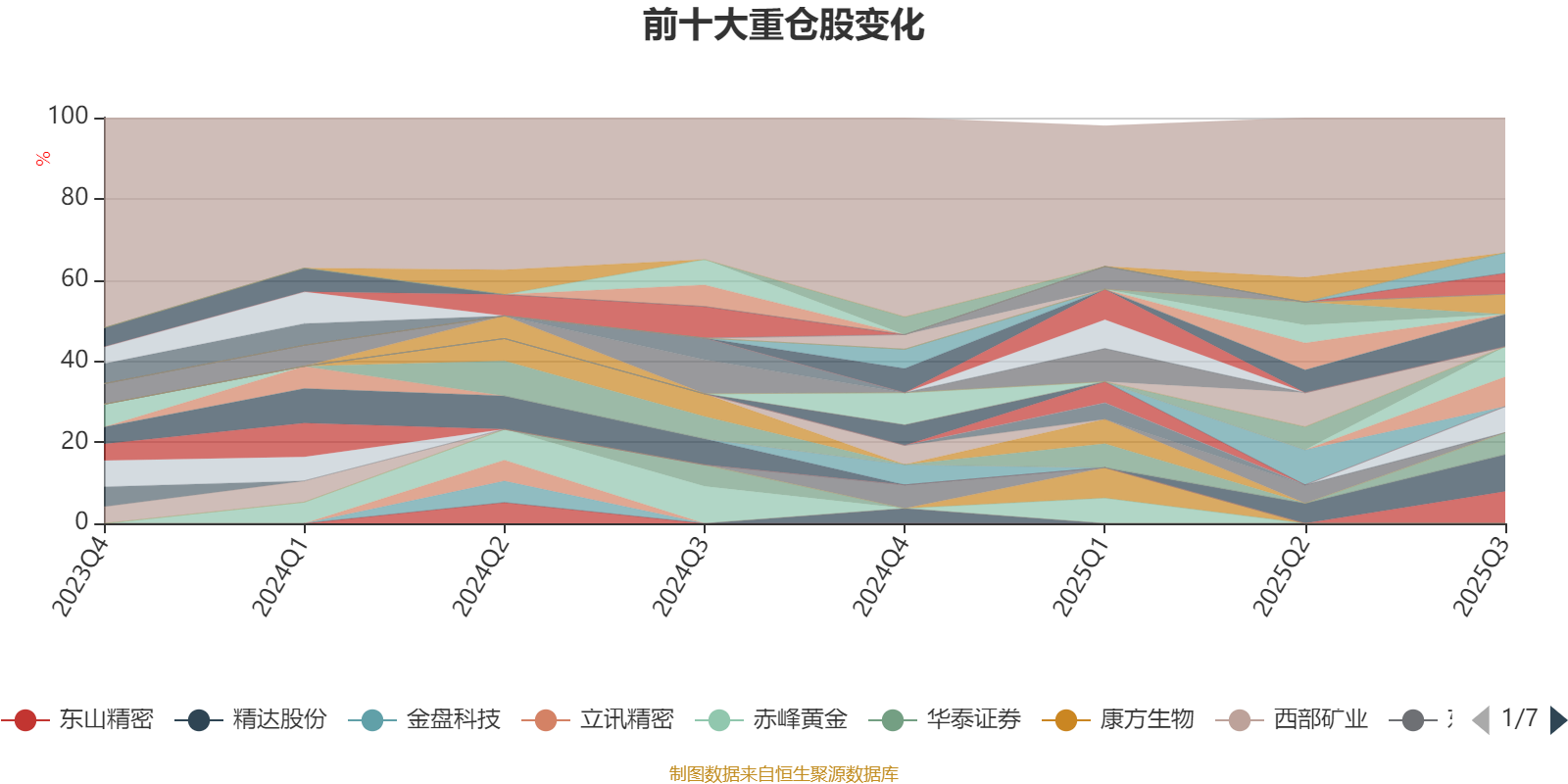 截至2025年三季度末,基金十大重仓股分别是紫金矿业、中芯国际、洛阳钼业、寒武纪、生益科技、芯原股份、中金黄金、山东黄金、九方智投控股、江淮汽车。