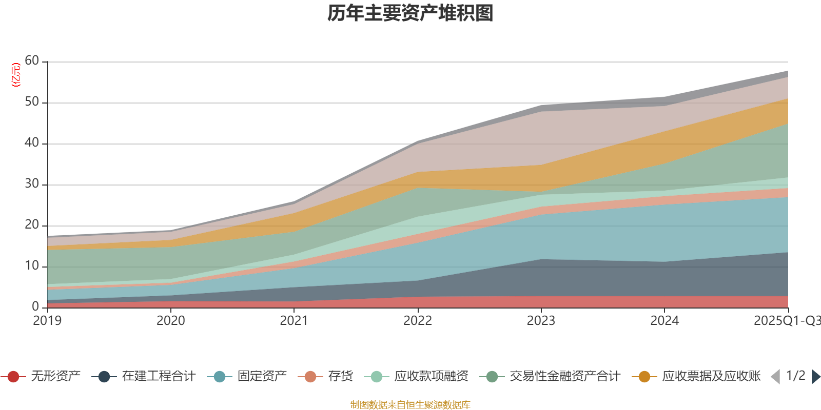 资产重大变化方面,截至2025年三季度末,公司交易性金融资产合计较上年末增加99.75%,占公司总资产比重上升9.94个百分点;应收票据及应收账款较上年末减少21.88%,占公司总资产比重下降4.68个百分点;固定资产较上年末减少3.58%,占公司总资产比重下降3.85个百分点;货币资金较上年末减少15.37%,占公司总资产比重下降2.95个百分点。