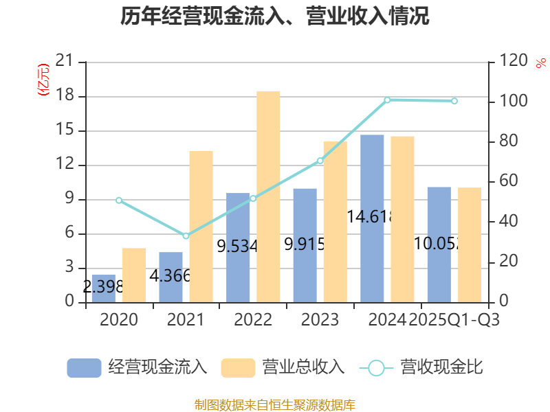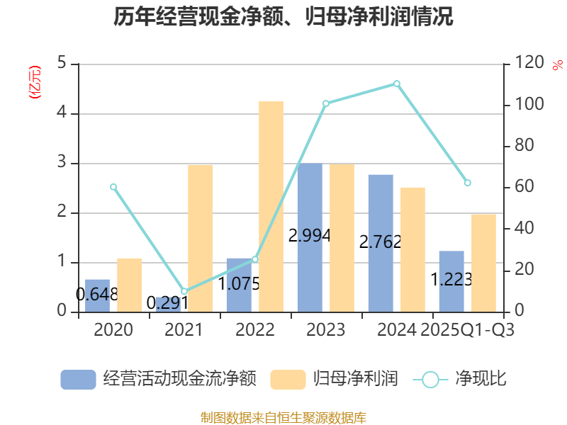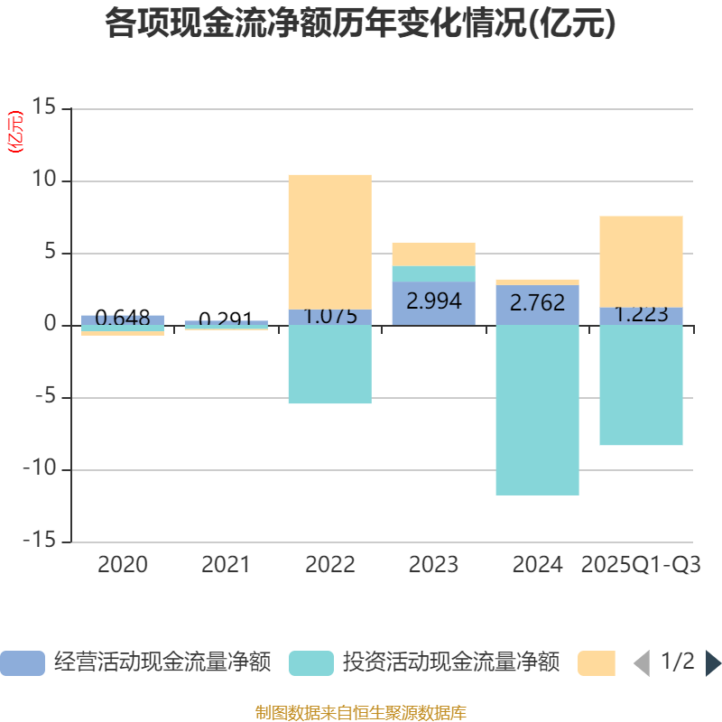 2025年前三季度,公司经营活动现金流净额为1.22亿元,同比增长65.36%;筹资活动现金流净额6.31亿元,同比增加6.04亿元;投资活动现金流净额-8.33亿元,上年同期为-10.53亿元。