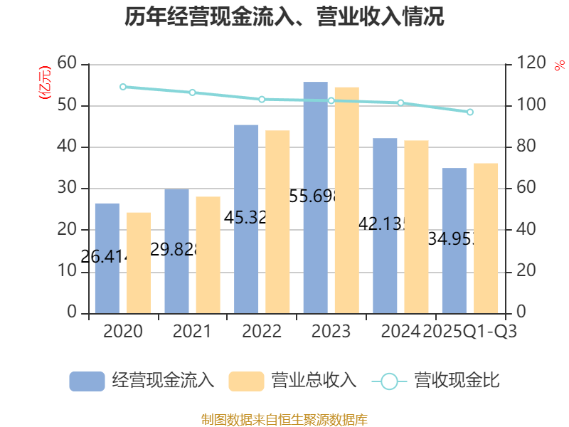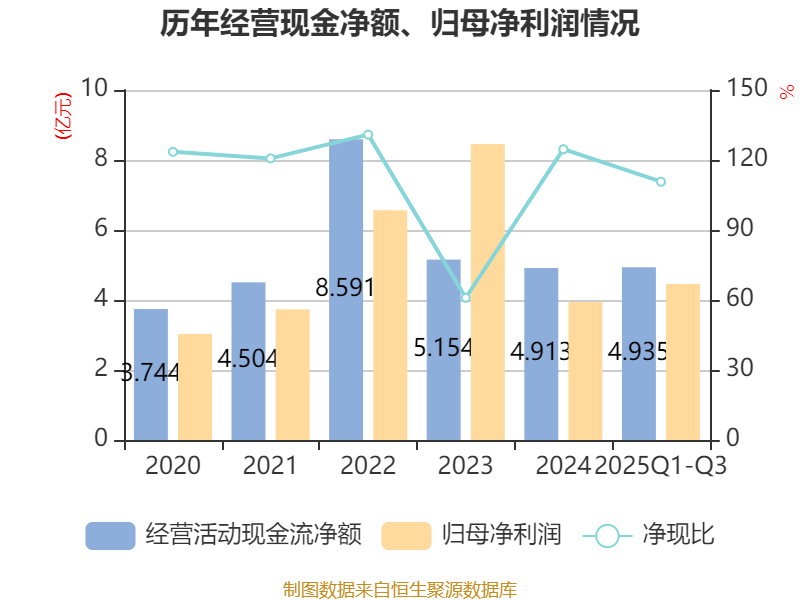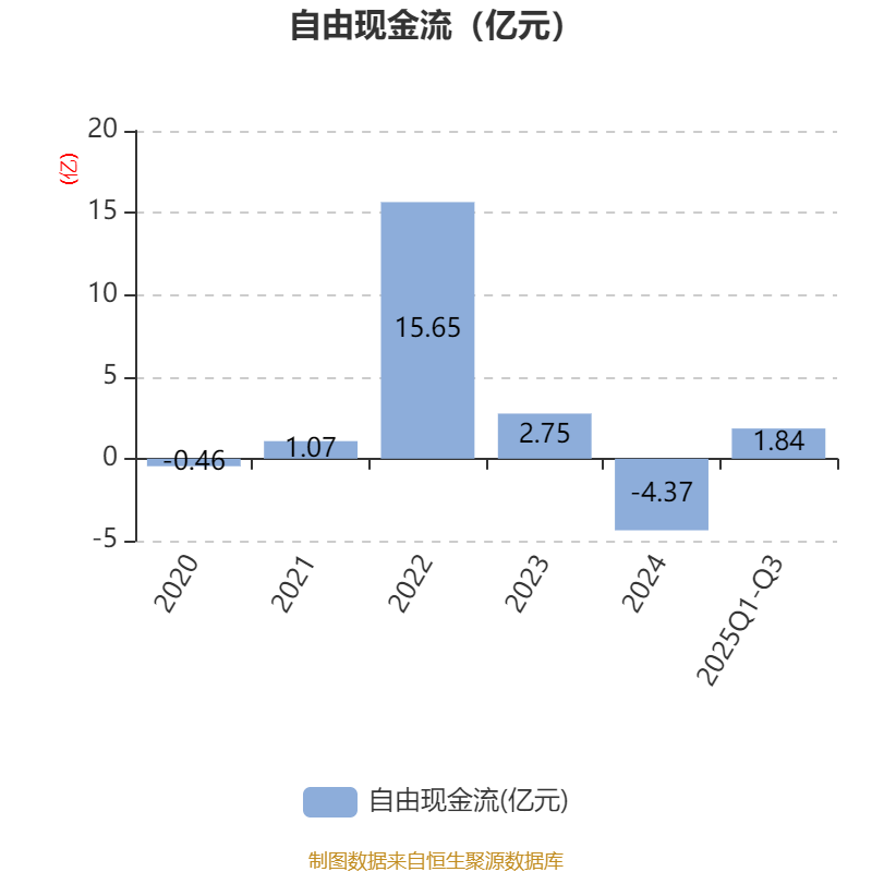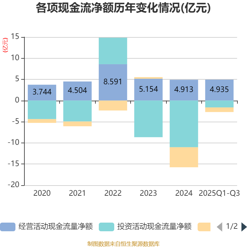 2025年前三季度,公司经营活动现金流净额为4.93亿元,同比增长195.87%;筹资活动现金流净额-1.09亿元,同比增加3.73亿元;投资活动现金流净额-1.62亿元,上年同期为-7.8亿元。