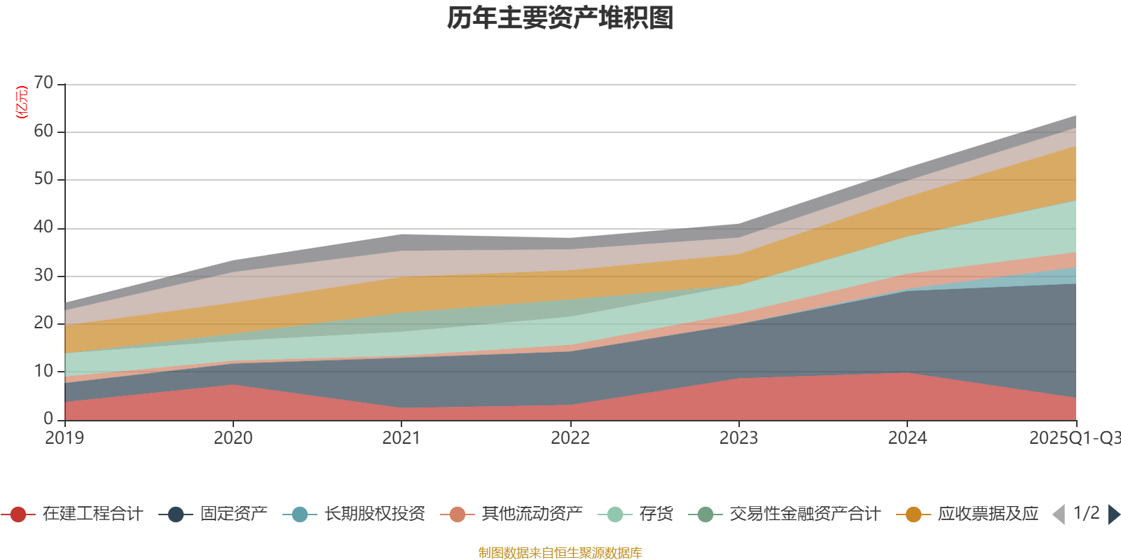 资产重大变化方面,截至2025年三季度末,公司在建工程合计较上年末减少53.05%,占公司总资产比重下降11.45个百分点;固定资产较上年末增加39.73%,占公司总资产比重上升5.1个百分点;长期股权投资较上年末增加610.53%,占公司总资产比重上升4.48个百分点;存货较上年末增加37.69%,占公司总资产比重上升2.08个百分点。