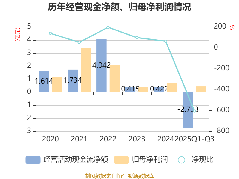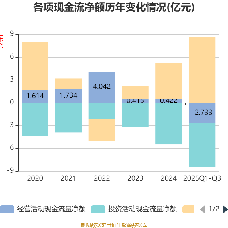 2025年前三季度,公司经营活动现金流净额为-2.73亿元,同比减少3372.78万元;筹资活动现金流净额8.63亿元,同比增加3.31亿元;投资活动现金流净额-5.75亿元,上年同期为-3.21亿元。