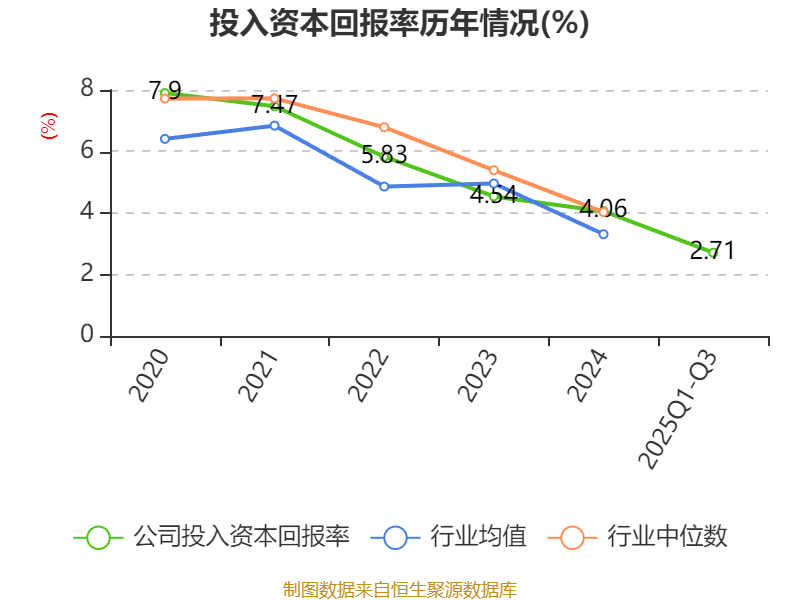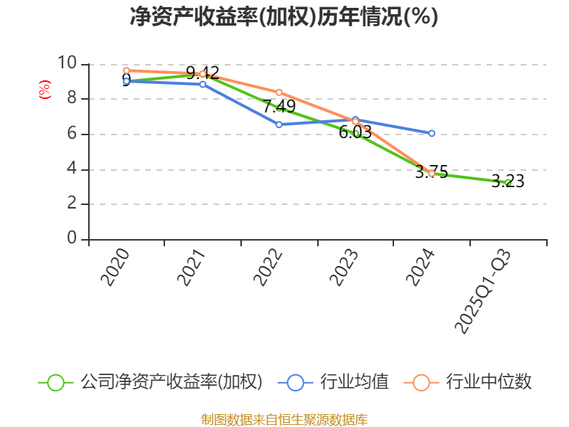 盈利能力方面, 2025年前三季度公司加权平均净资产收益率为3.23%,同比下降2.12个百分点。公司2025年前三季度投入资本回报率为2.71%,较上年同期下降1.66个百分点。