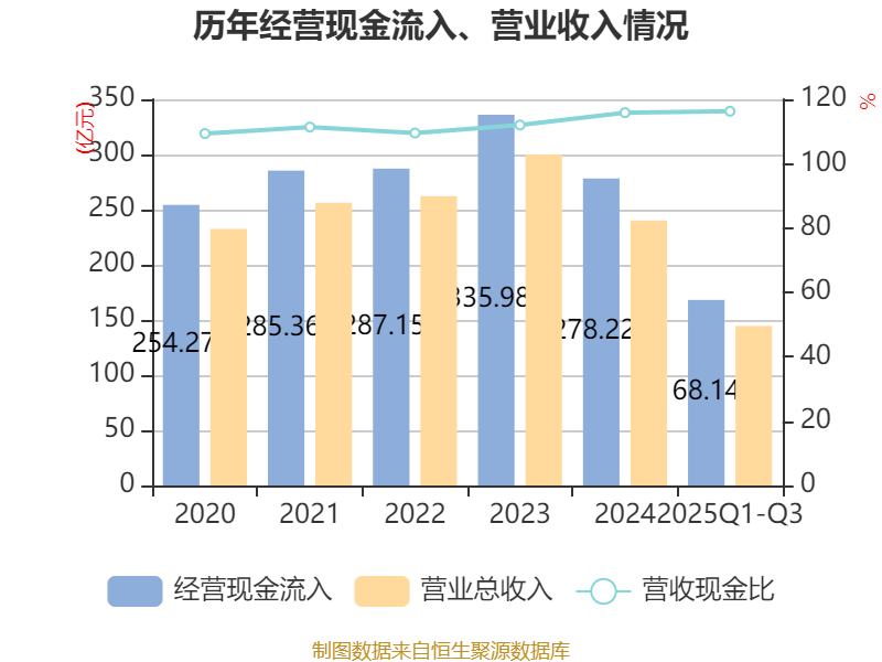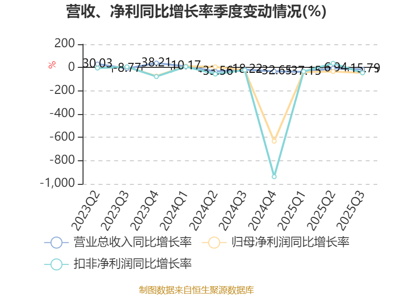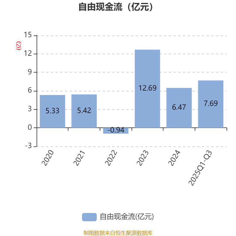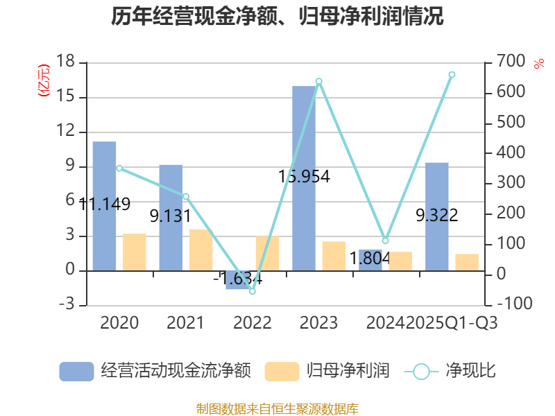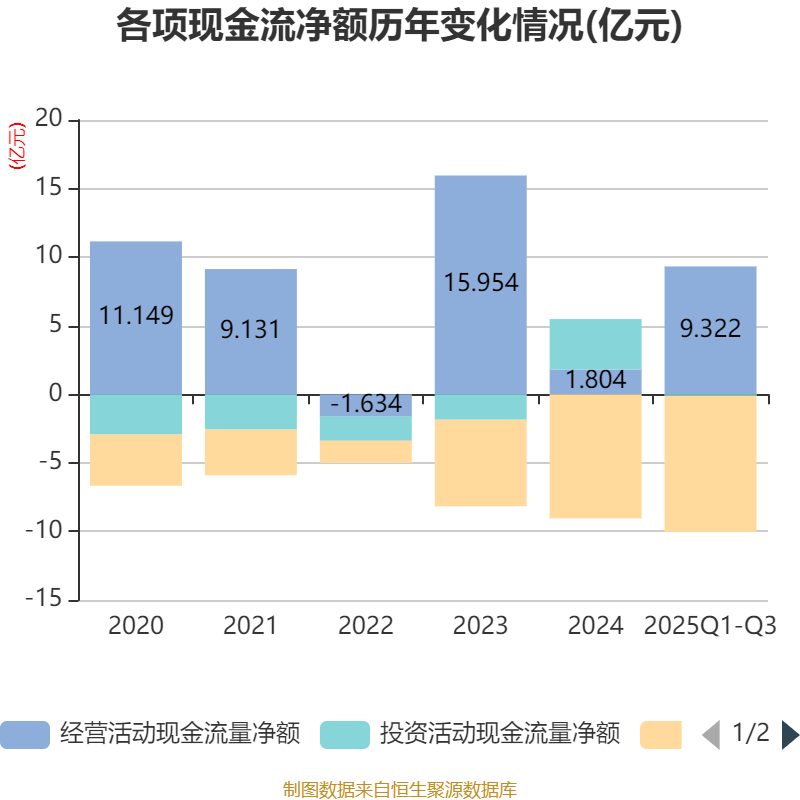 2025年前三季度,公司经营活动现金流净额为9.32亿元,同比增长428.56%;筹资活动现金流净额-9.92亿元,同比减少1.62亿元;投资活动现金流净额-1059.01万元,上年同期为2.28亿元。