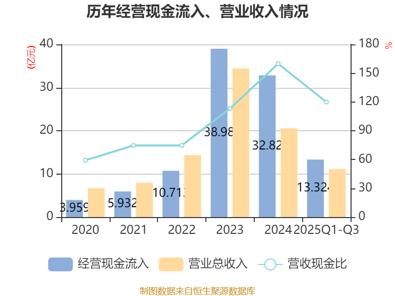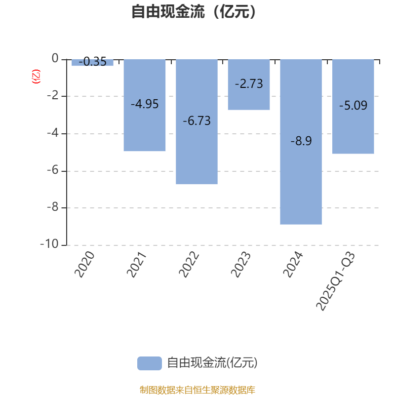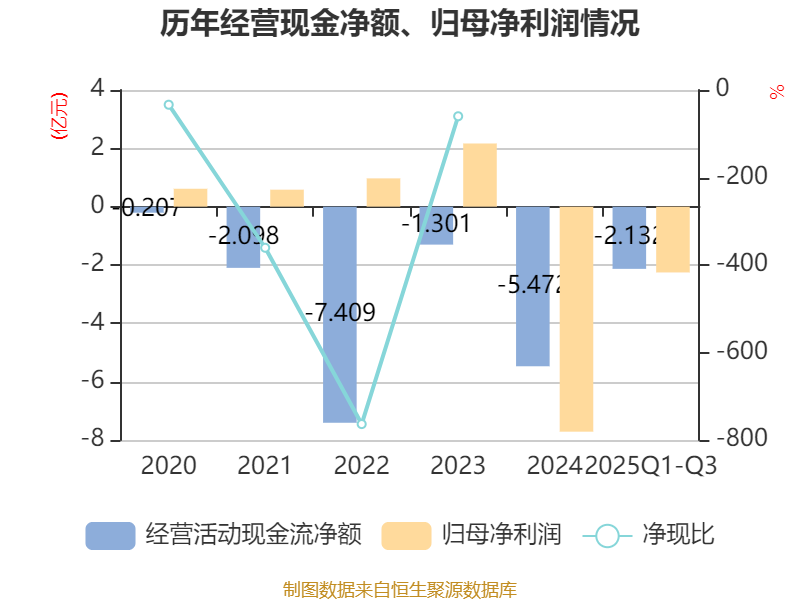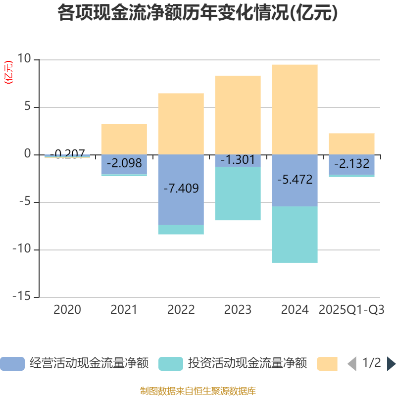 2025年前三季度,公司经营活动现金流净额为-2.13亿元,同比增加3.25亿元;筹资活动现金流净额2.22亿元,同比减少8.53亿元;投资活动现金流净额-2243.7万元,上年同期为-4.77亿元。