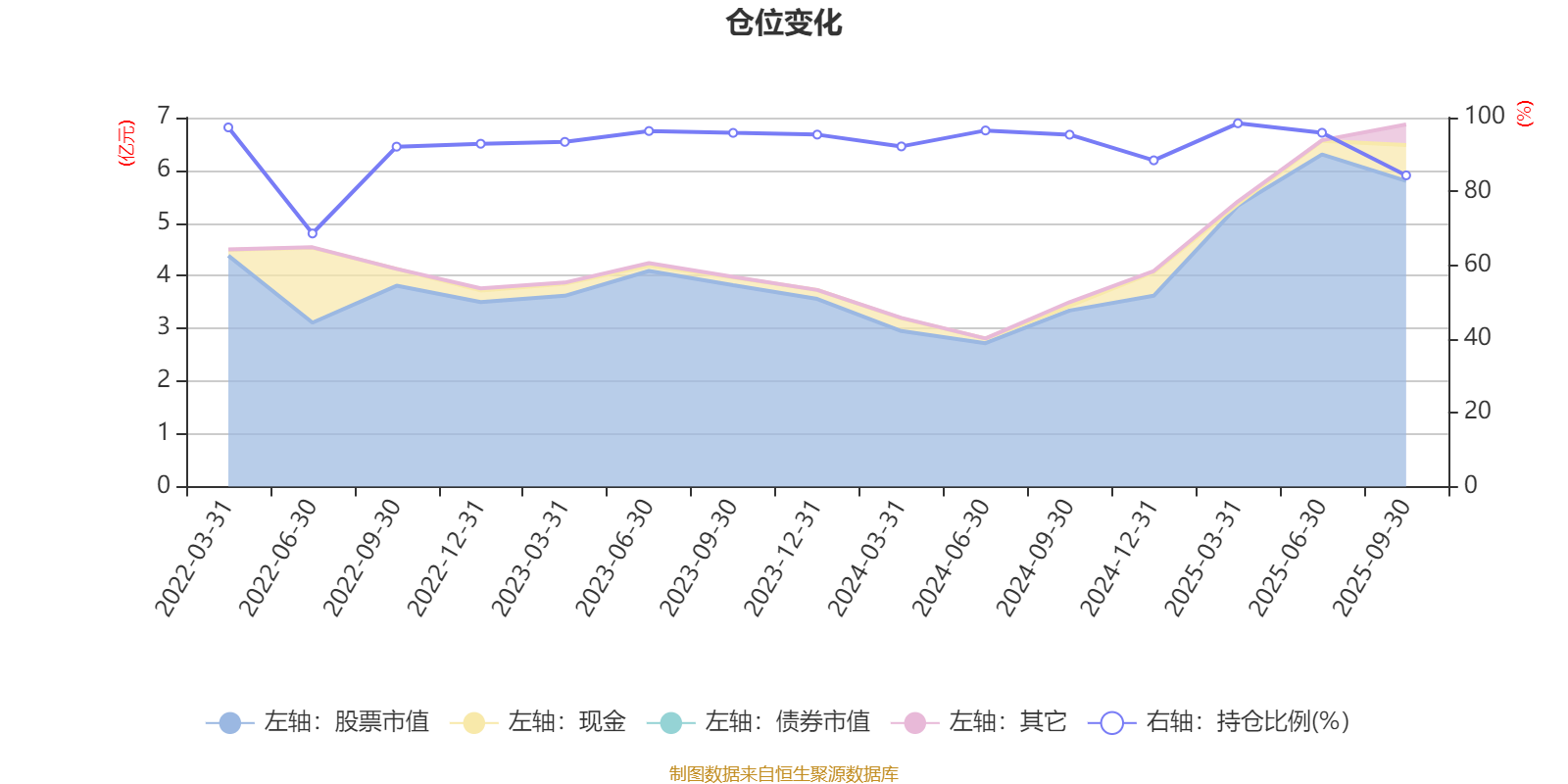 据定期报告数据统计,近三年平均股票仓位为93.76%,同类平均为85.84%。2025年一季度末基金达到98.46%的最高仓位,2022年上半年末最低,为68.59%。