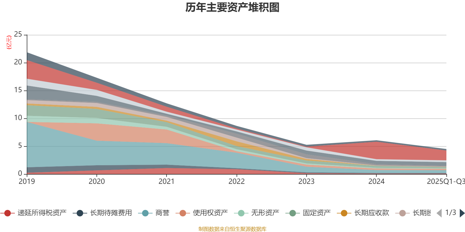 资产重大变化方面,截至2025年三季度末,公司货币资金较上年末减少43.71%,占公司总资产比重下降12.43个百分点;其他应收款(含利息和股利)较上年末增加8.31%,占公司总资产比重上升4.54个百分点;商誉较上年末没有变化,占公司总资产比重上升3.07个百分点;应收票据及应收账款较上年末增加13.99%,占公司总资产比重上升2.57个百分点。