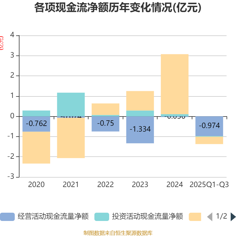 2025年前三季度,公司经营活动现金流净额为-9743.86万元,同比减少7863.09万元;筹资活动现金流净额-3669.71万元,同比减少4569.24万元;投资活动现金流净额-308.34万元,上年同期为385.04万元。
