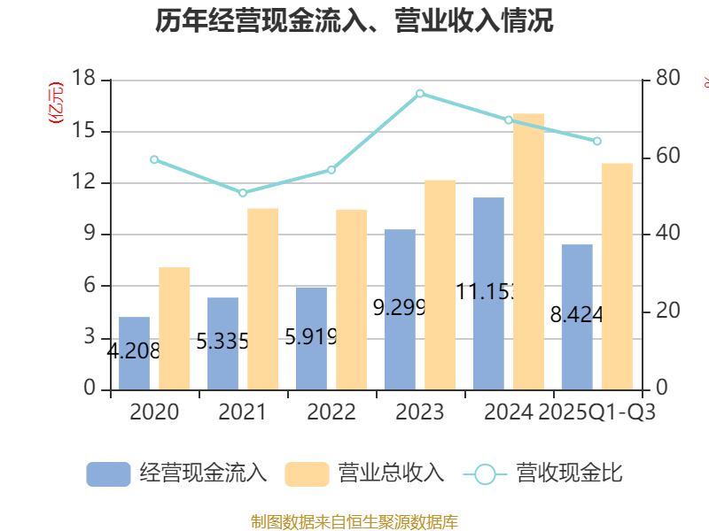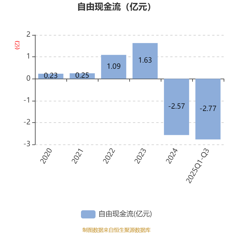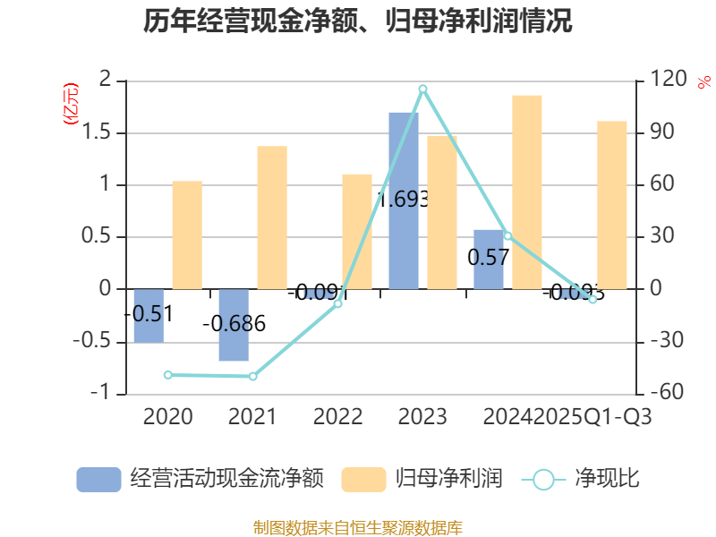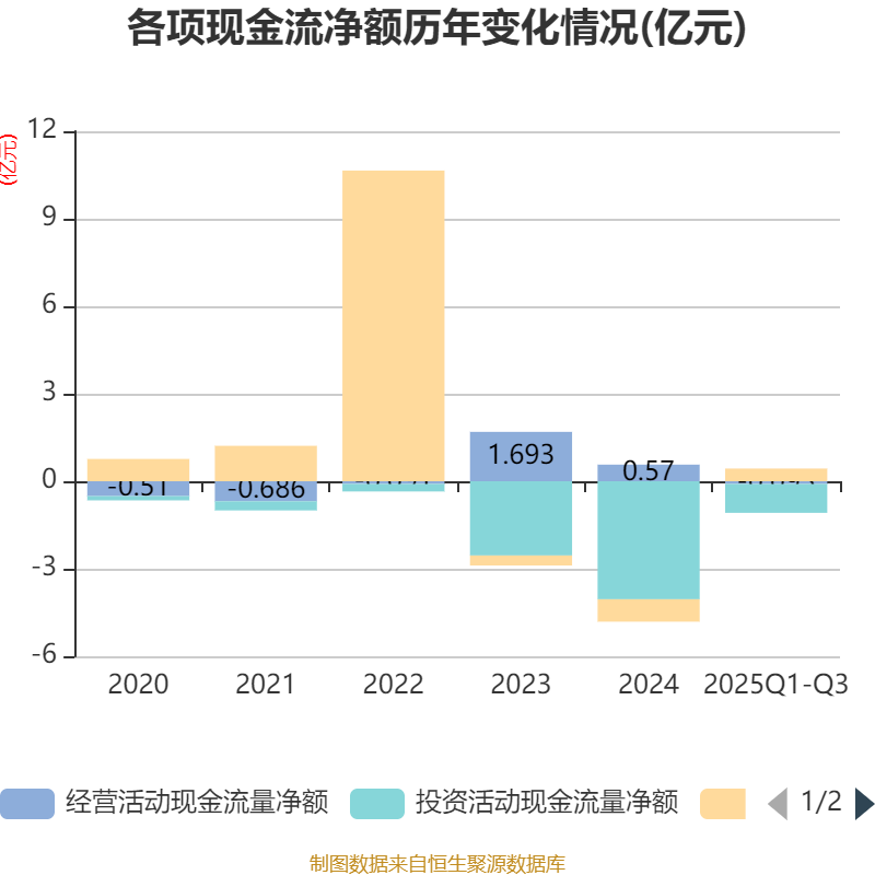2025年前三季度,公司经营活动现金流净额为-928.14万元,同比增加4570.29万元;筹资活动现金流净额4352.44万元,同比增加1.43亿元;投资活动现金流净额-9897.14万元,上年同期为-7.06亿元。