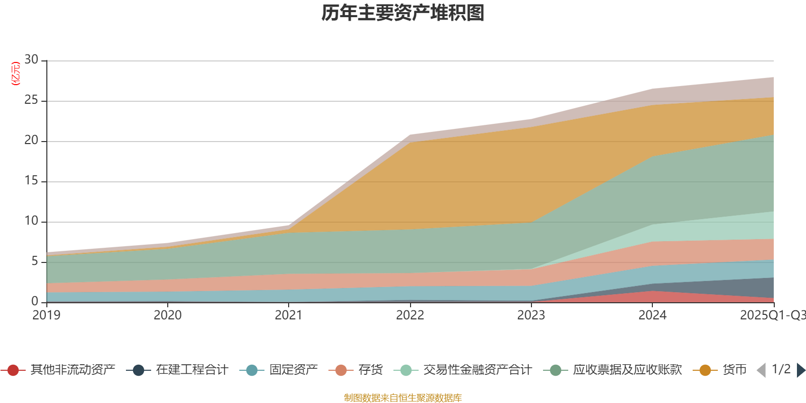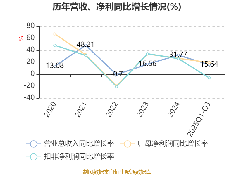 资产重大变化方面,截至2025年三季度末,公司货币资金较上年末减少27.04%,占公司总资产比重下降7.41个百分点;在建工程合计较上年末增加184.72%,占公司总资产比重上升5.73个百分点;交易性金融资产合计较上年末增加60.93%,占公司总资产比重上升4.2个百分点;其他非流动资产较上年末减少63.42%,占公司总资产比重下降3.48个百分点。