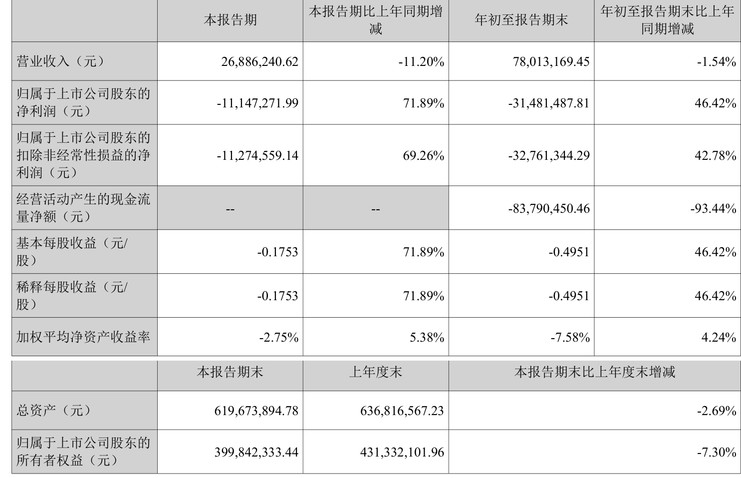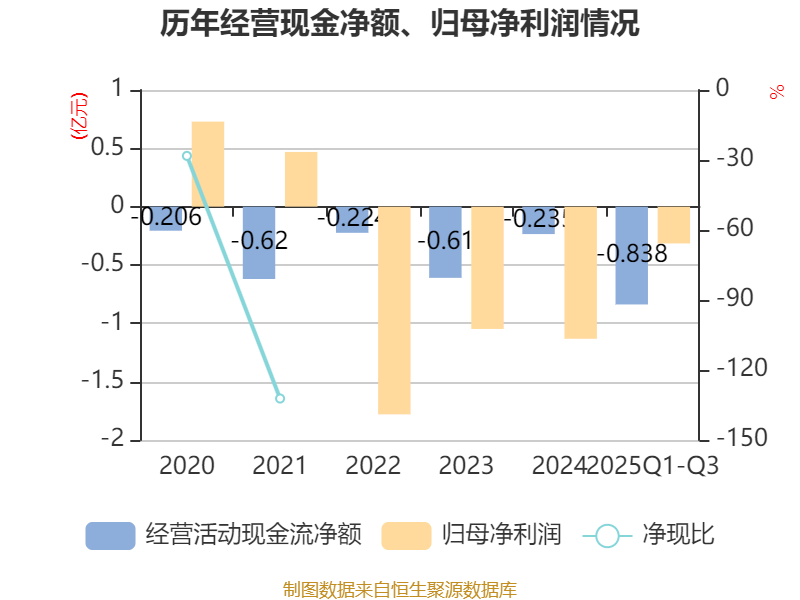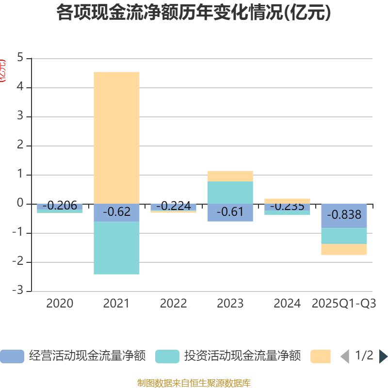 2025年前三季度,公司经营活动现金流净额为-8379.05万元,同比减少4047.37万元;筹资活动现金流净额-3780.35万元,同比减少5772.06万元;投资活动现金流净额-5449.48万元,上年同期为-4626.44万元。