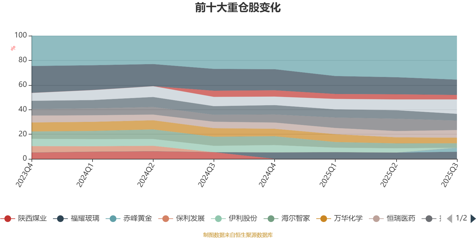 该基金持股集中度较高,且持股标的较为稳定,近2年前十大重仓股集中度长期超过60%。截至2025年三季度末,基金十大重仓股分别是贵州茅台、紫金矿业、招商银行、恒瑞医药、福耀玻璃、长江电力、万华化学、中国平安、海尔智家、赤峰黄金。