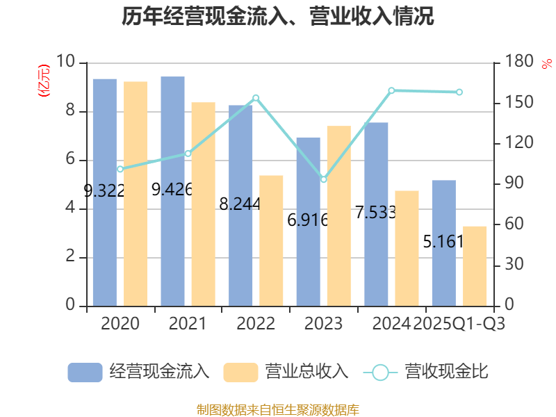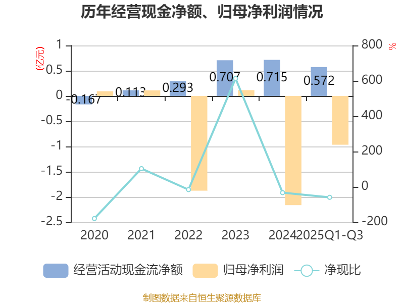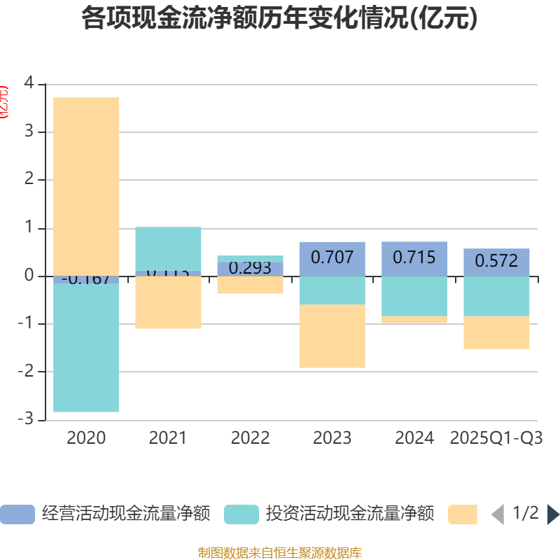 2025年前三季度,公司经营活动现金流净额为5717.86万元,同比增长979.8%;筹资活动现金流净额-6841.79万元,同比减少1.06亿元;投资活动现金流净额-8398.11万元,上年同期为-6356.59万元。