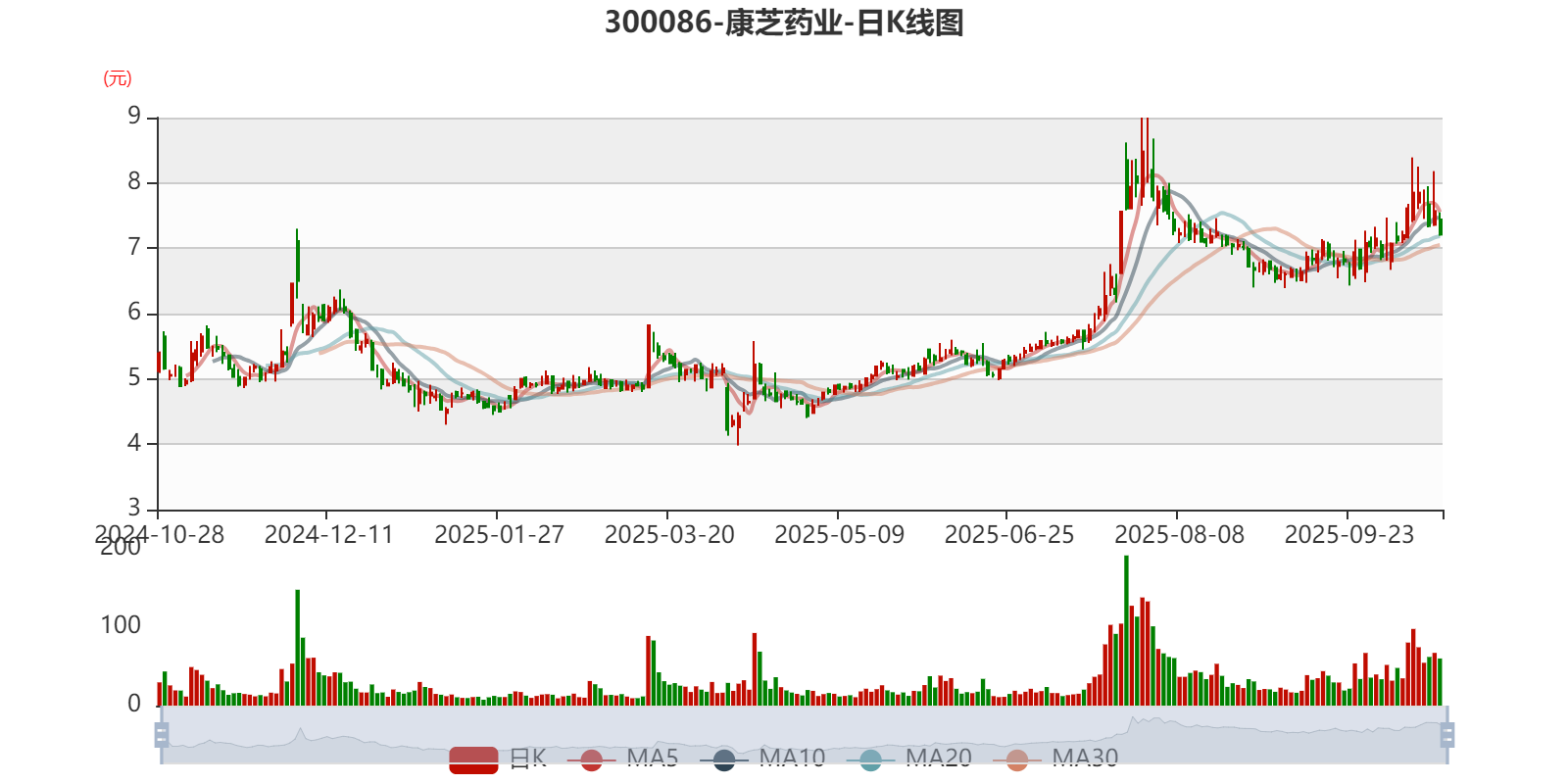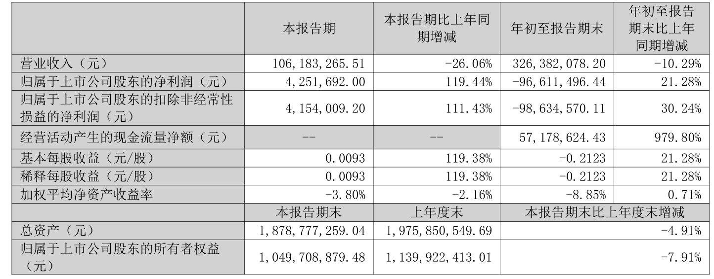中证智能财讯康芝药业(300086)10月27日披露2025年第三季度报告。前三季度公司实现营业总收入3.26亿元,同比下降10.29%;归母净利润亏损9661.15万元,上年同期亏损1.23亿元;扣非净利润亏损9863.46万元,上年同期亏损1.41亿元;经营活动产生的现金流量净额为5717.86万元,同比增长979.80%;报告期内,康芝药业基本每股收益为-0.2123元,加权平均净资产收益率为-8.85%。