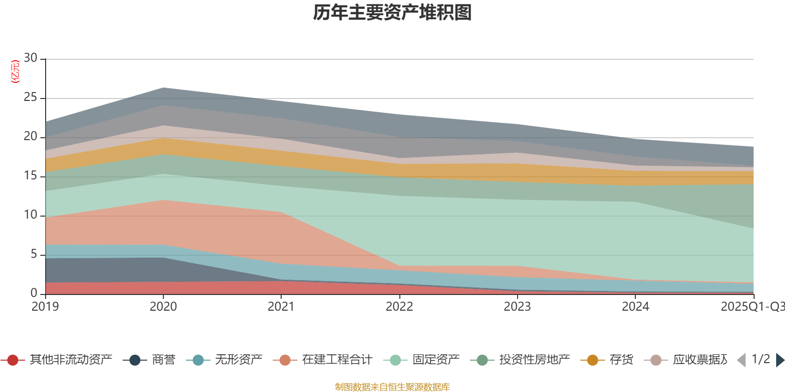 资产重大变化方面,截至2025年三季度末,公司投资性房地产较上年末增加173.84%,占公司总资产比重上升19.63个百分点;固定资产较上年末减少30.79%,占公司总资产比重下降13.67个百分点;货币资金较上年末减少84.14%,占公司总资产比重下降4.77个百分点;无形资产较上年末减少27.18%,占公司总资产比重下降1.66个百分点。