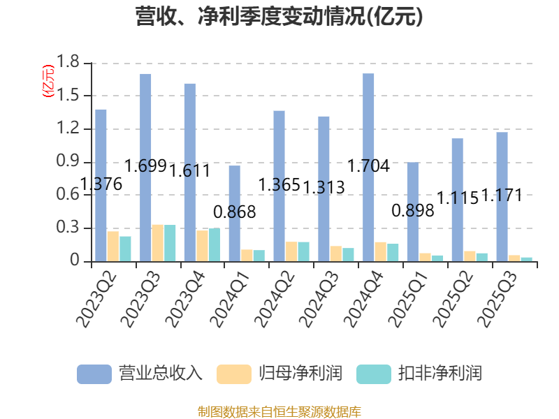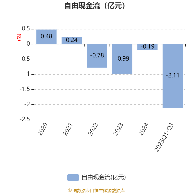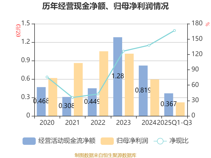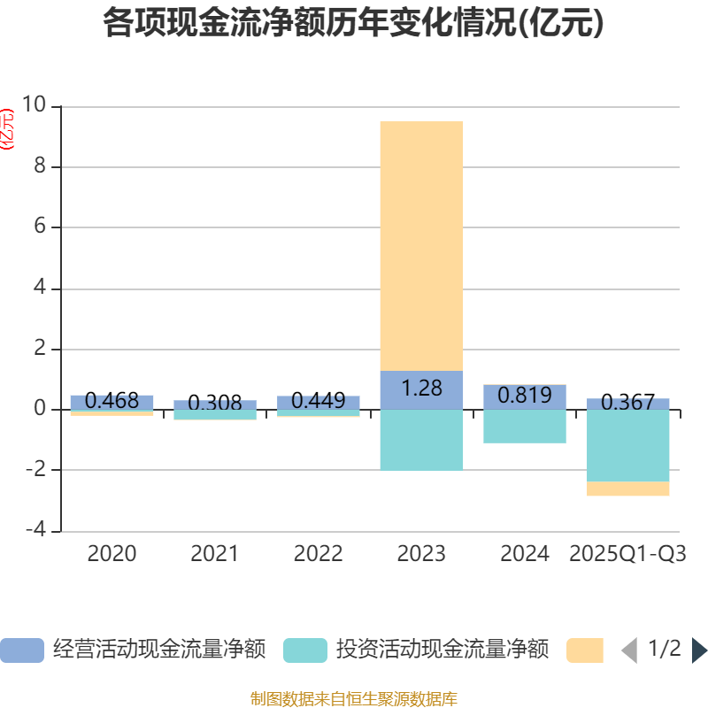2025年前三季度,公司经营活动现金流净额为3670.94万元,同比增长0.39%;筹资活动现金流净额-4613.18万元,同比减少5059.31万元;投资活动现金流净额-2.38亿元,上年同期为-1.09亿元。
