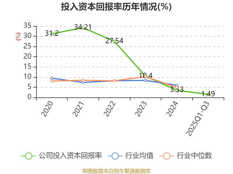 盈利能力方面, 2025年前三季度公司加权平均净资产收益率为1.67%,同比下降1.5个百分点。公司2025年前三季度投入资本回报率为1.49%,较上年同期下降0.82个百分点。