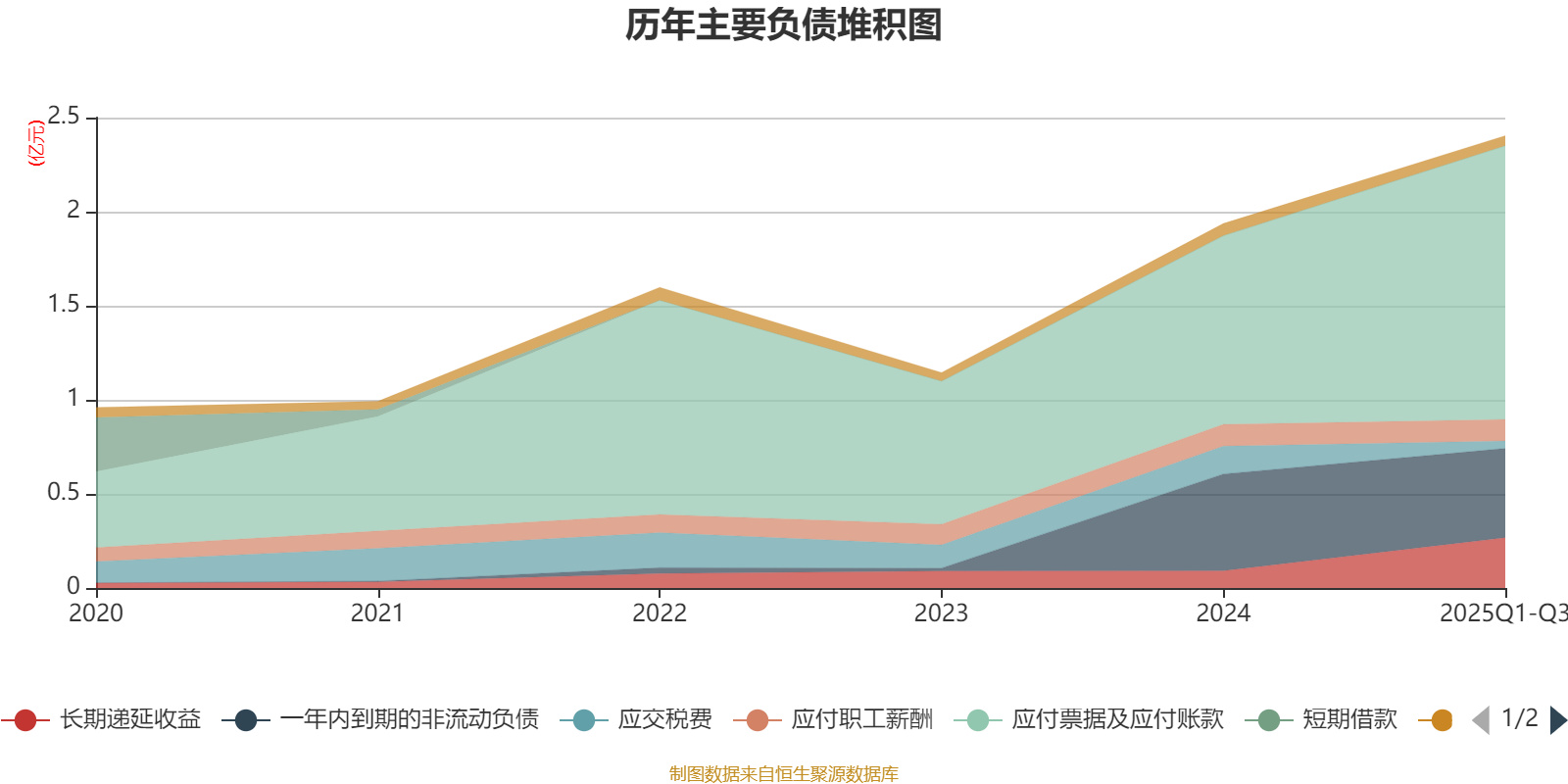 负债重大变化方面,截至2025年三季度末,公司应付票据及应付账款较上年末增加45.13%,占公司总资产比重上升2.79个百分点;长期递延收益较上年末增加192.32%,占公司总资产比重上升1.12个百分点;应交税费较上年末减少73.55%,占公司总资产比重下降0.72个百分点;一年内到期的非流动负债较上年末减少7.72%,占公司总资产比重下降0.32个百分点。