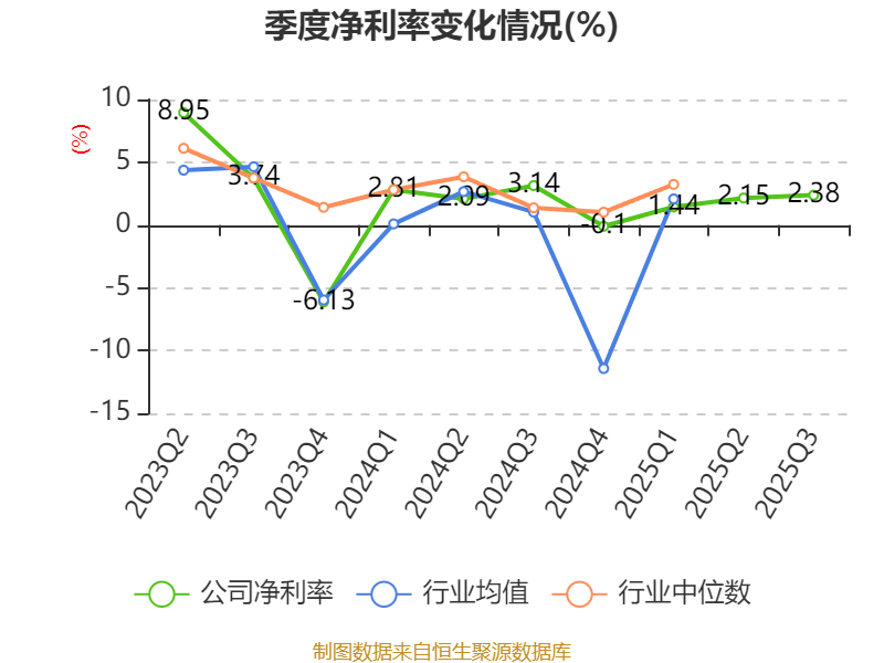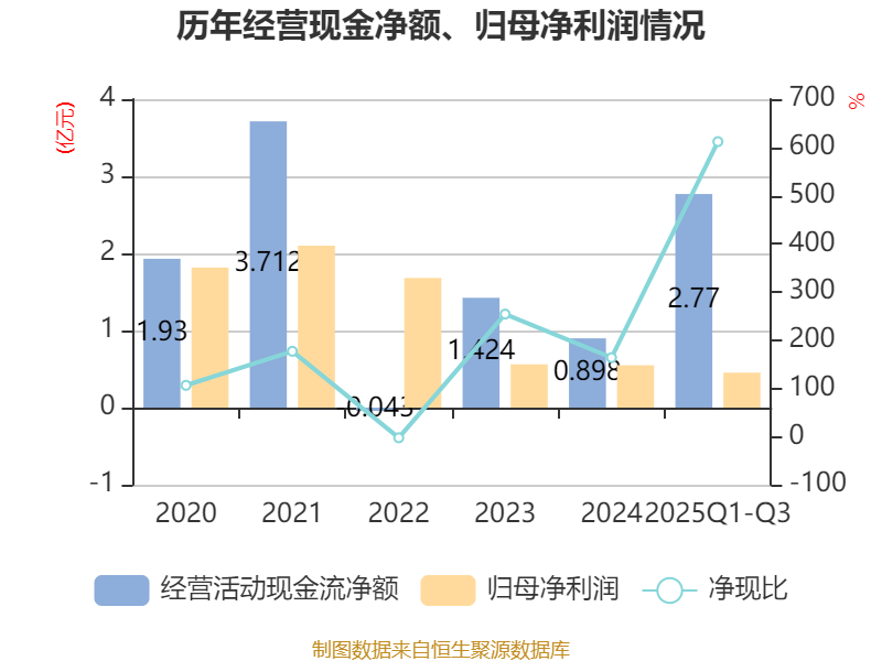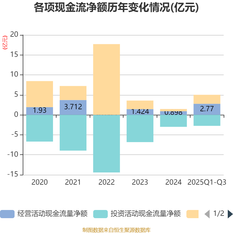 2025年前三季度,公司经营活动现金流净额为2.77亿元,同比增长83.39%;筹资活动现金流净额2.25亿元,同比增加7460.24万元;投资活动现金流净额-2.75亿元,上年同期为-4.24亿元。