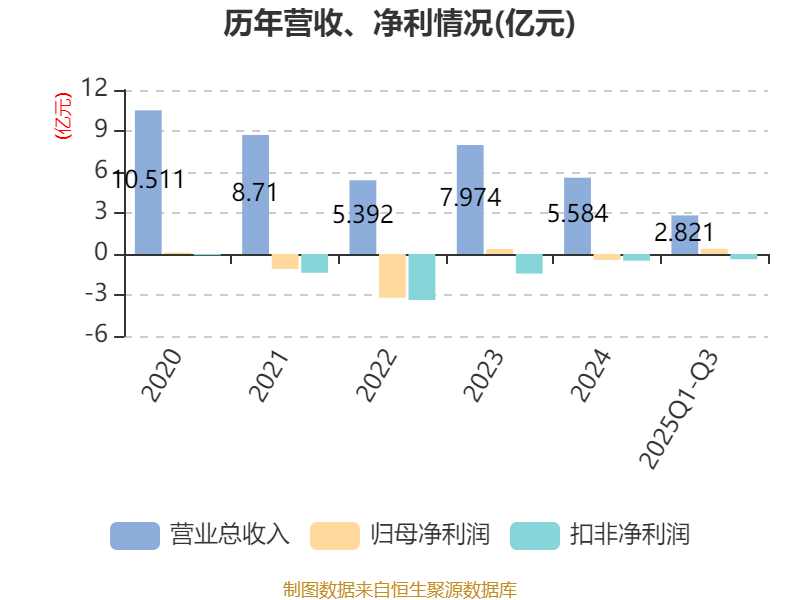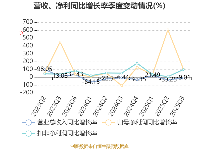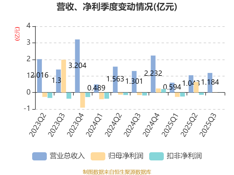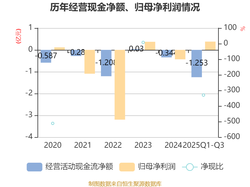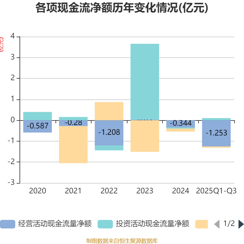 2025年前三季度,公司经营活动现金流净额为-1.25亿元,同比增加2898.97万元;筹资活动现金流净额-609.77万元,同比增加390.84万元;投资活动现金流净额1032.63万元,上年同期为-467.22万元。