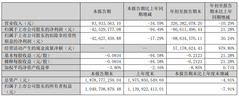 其中,第三季度公司营业收入为9393万元,同比下降34.59%;归母净利润亏损4253万元,同比下降94.49%;扣非归母净利润亏损4263万元,同比下降17.29%。