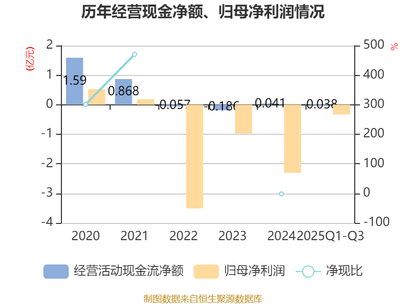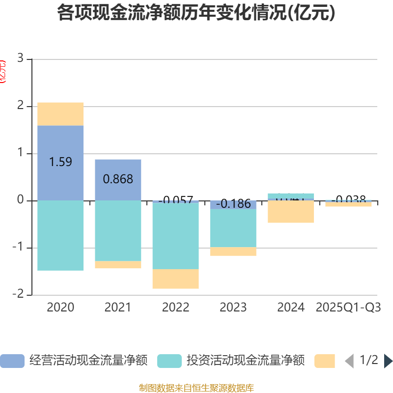 2025年前三季度,公司经营活动现金流净额为-384.46万元,同比减少788.43万元;筹资活动现金流净额-914.21万元,同比增加2995.68万元;投资活动现金流净额108.82万元,上年同期为-31.18万元。