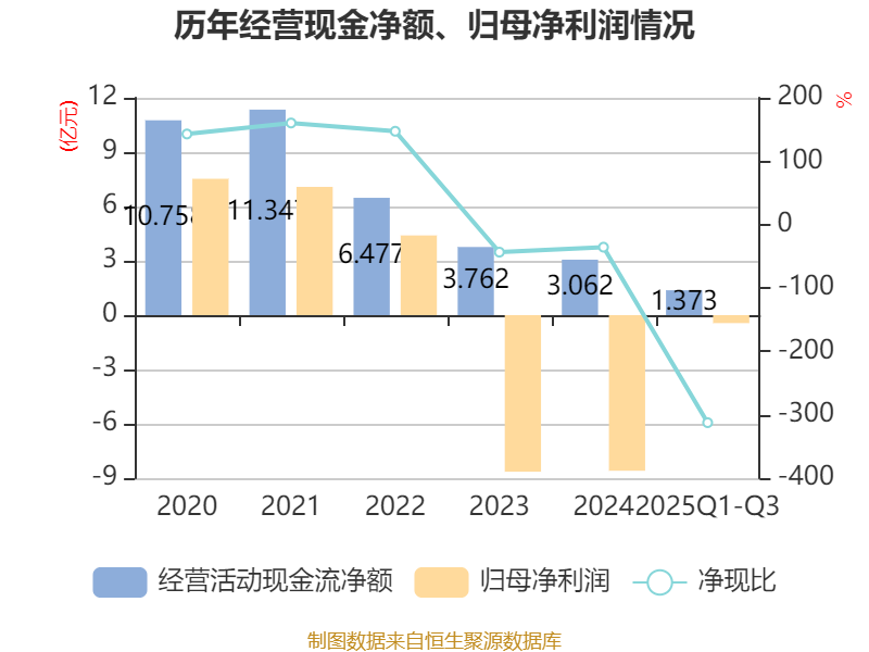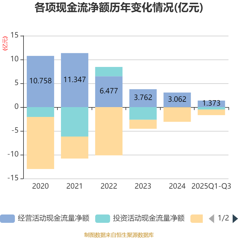 2025年前三季度,公司经营活动现金流净额为1.37亿元,同比下降36.96%;筹资活动现金流净额-1.17亿元,同比减少375.15万元;投资活动现金流净额-5130.39万元,上年同期为2404.96万元。