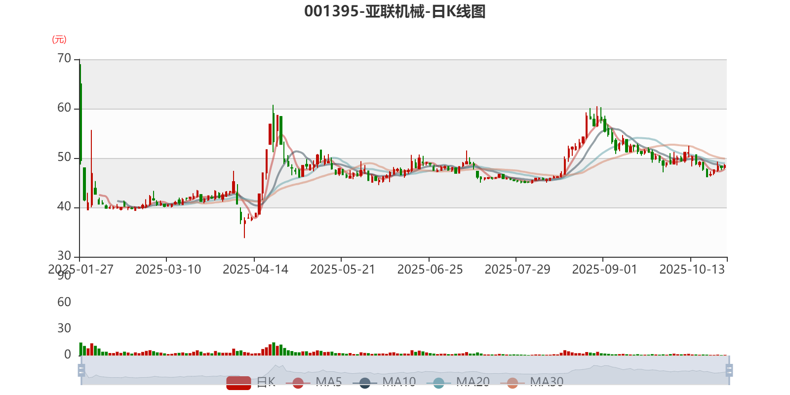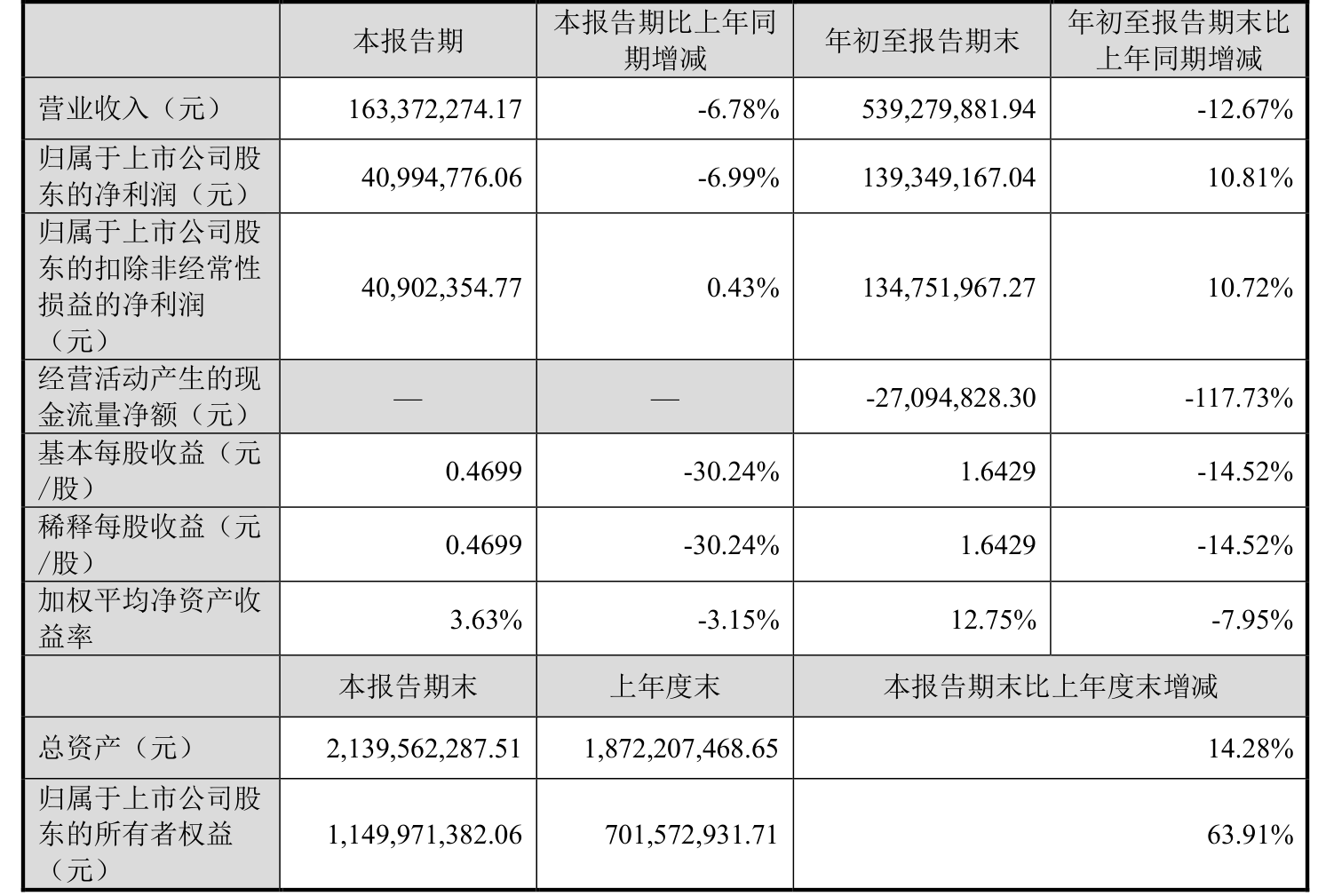 中证智能财讯亚联机械(001395)10月27日披露2025年第三季度报告。前三季度公司实现营业总收入5.39亿元,同比下降12.67%;归母净利润1.39亿元,同比增长10.81%;扣非净利润1.35亿元,同比增长10.72%;经营活动产生的现金流量净额为-2709.48万元,上年同期为1.53亿元;报告期内,亚联机械基本每股收益为1.6429元,加权平均净资产收益率为12.75%。