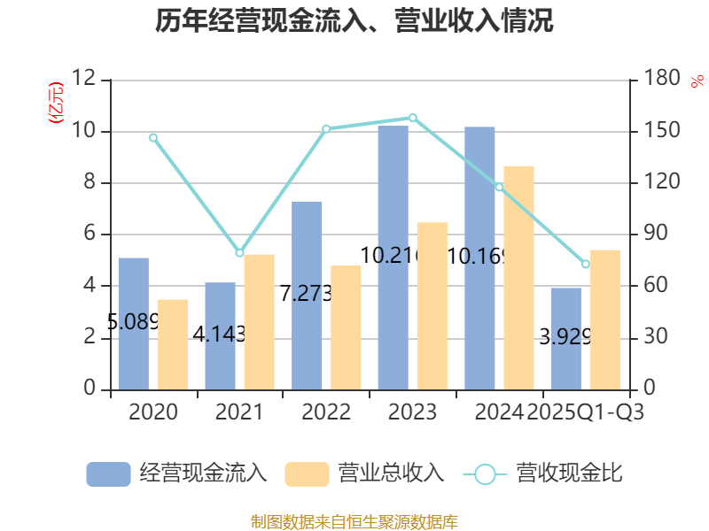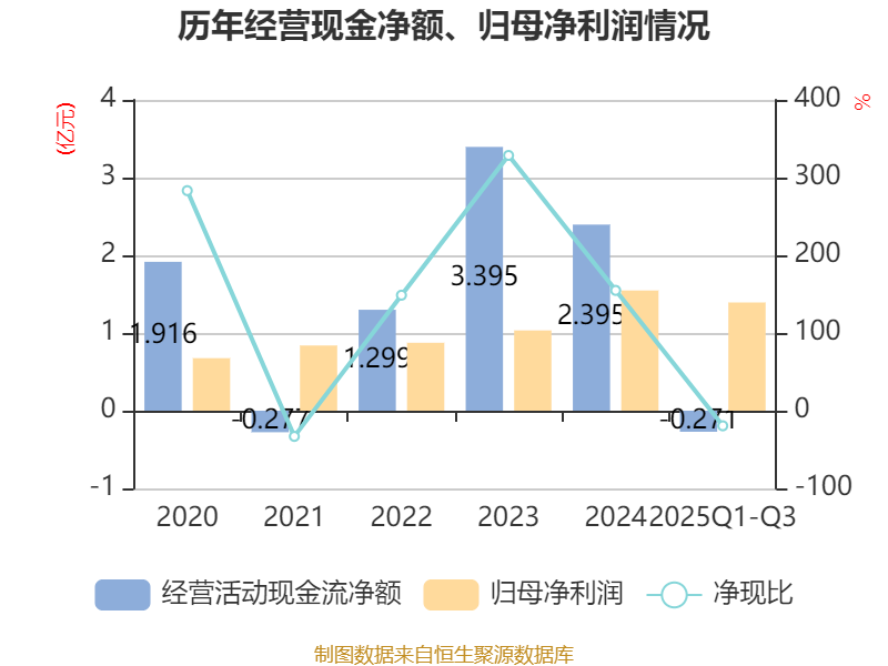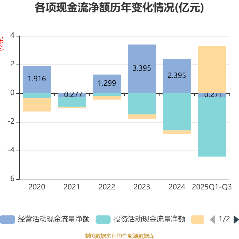 2025年前三季度,公司经营活动现金流净额为-2709.48万元,同比减少1.8亿元;筹资活动现金流净额3.27亿元,同比增加3.52亿元;投资活动现金流净额-4.15亿元,上年同期为-2.17亿元。