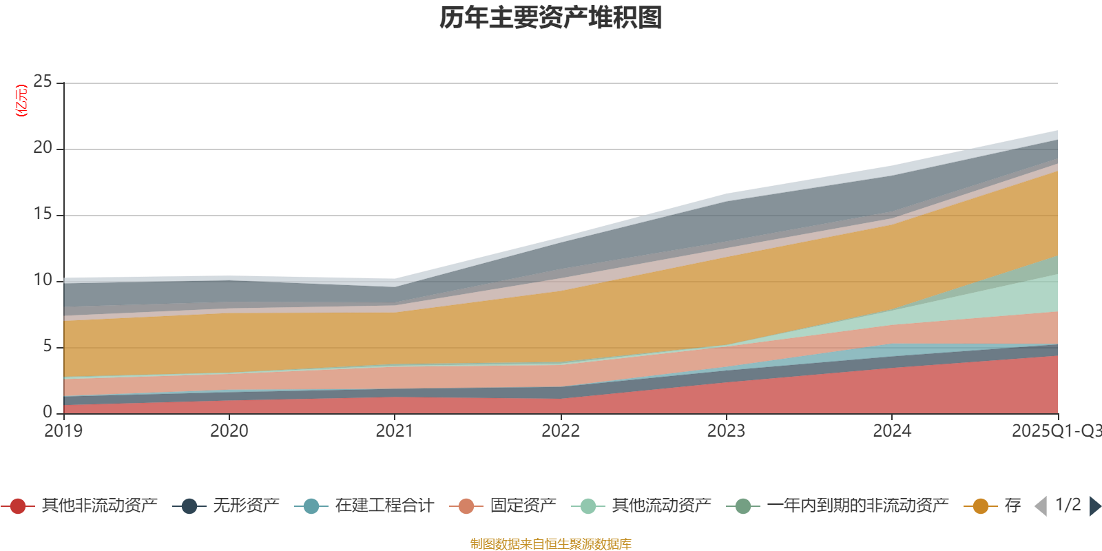 资产重大变化方面,截至2025年三季度末,公司货币资金较上年末减少47.67%,占公司总资产比重下降7.87个百分点;其他流动资产较上年末增加159.77%,占公司总资产比重上升7.4个百分点;一年内到期的非流动资产较上年末增加1260.88%,占公司总资产比重上升6.02个百分点;在建工程合计较上年末减少96.49%,占公司总资产比重下降5.02个百分点。