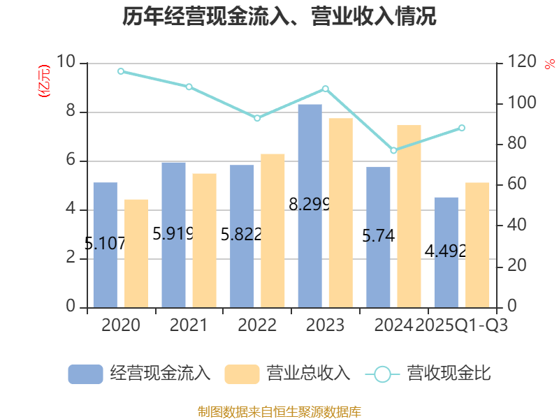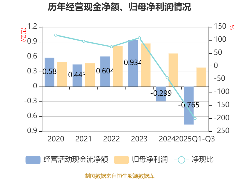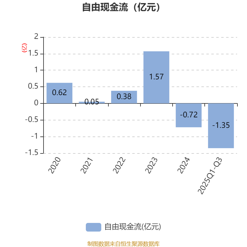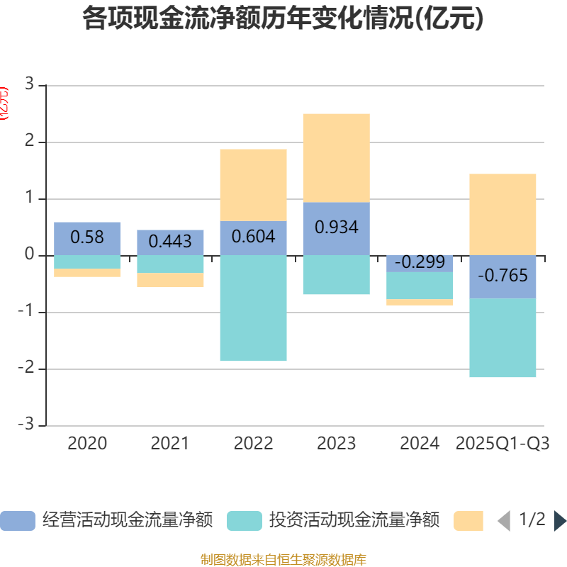 2025年前三季度,公司经营活动现金流净额为-7648.84万元,同比增加6697.34万元;筹资活动现金流净额1.43亿元,同比增加1.64亿元;投资活动现金流净额-1.39亿元,上年同期为-2989.45万元。