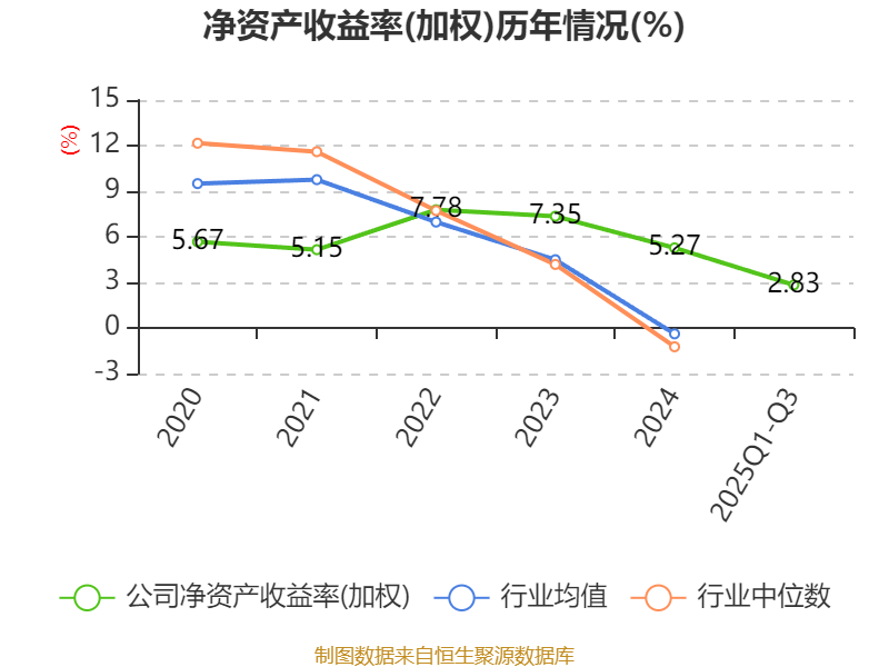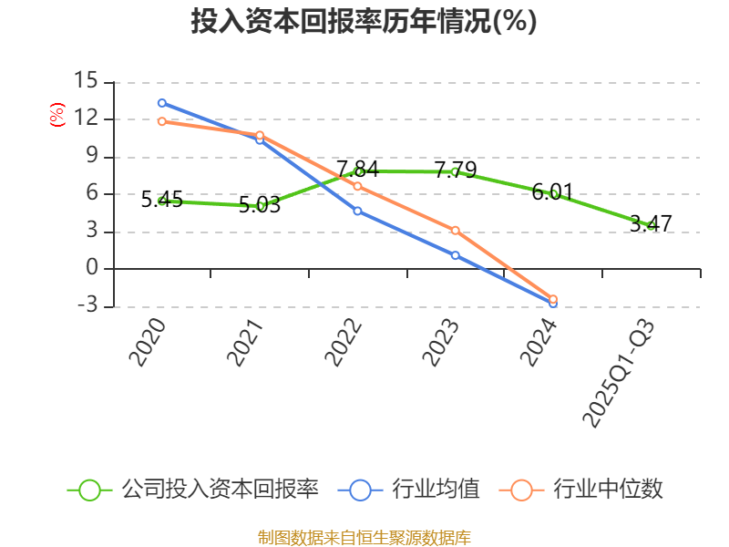 盈利能力方面, 2025年前三季度公司加权平均净资产收益率为2.83%,同比下降0.8个百分点。公司2025年前三季度投入资本回报率为3.47%,较上年同期下降1.01个百分点。