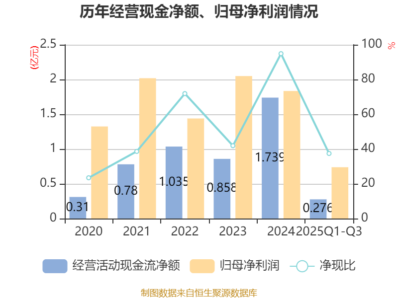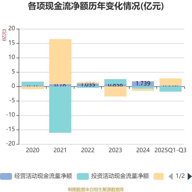 2025年前三季度,公司经营活动现金流净额为2762.81万元,同比增加1.06亿元;筹资活动现金流净额2.52亿元,同比增加4874.32万元;投资活动现金流净额-1.81亿元,上年同期为-2.08亿元。