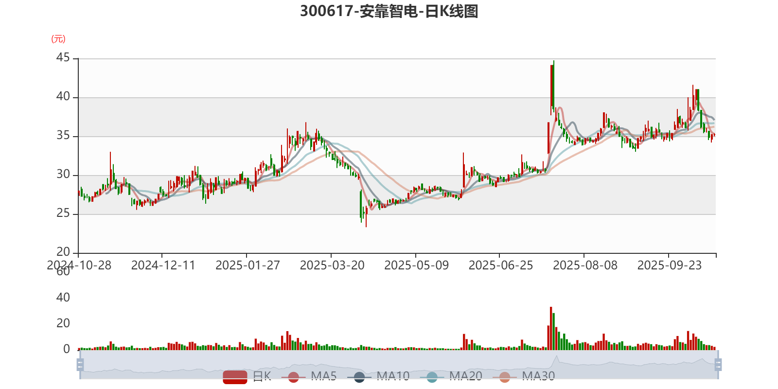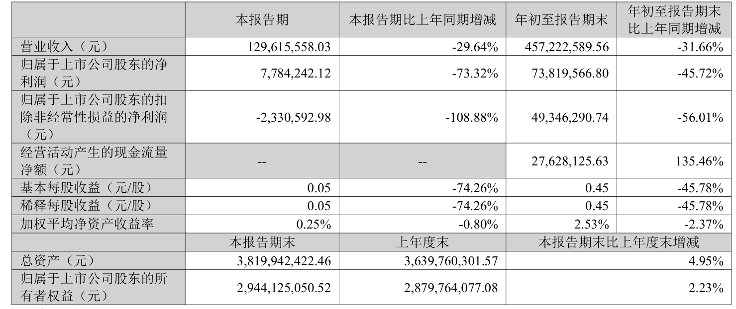 中证智能财讯安靠智电(300617)10月27日披露2025年第三季度报告。前三季度公司实现营业总收入4.57亿元,同比下降31.66%;归母净利润7381.96万元,同比下降45.72%;扣非净利润4934.63万元,同比下降56.01%;经营活动产生的现金流量净额为2762.81万元,上年同期为-7792.43万元;报告期内,安靠智电基本每股收益为0.45元,加权平均净资产收益率为2.53%。