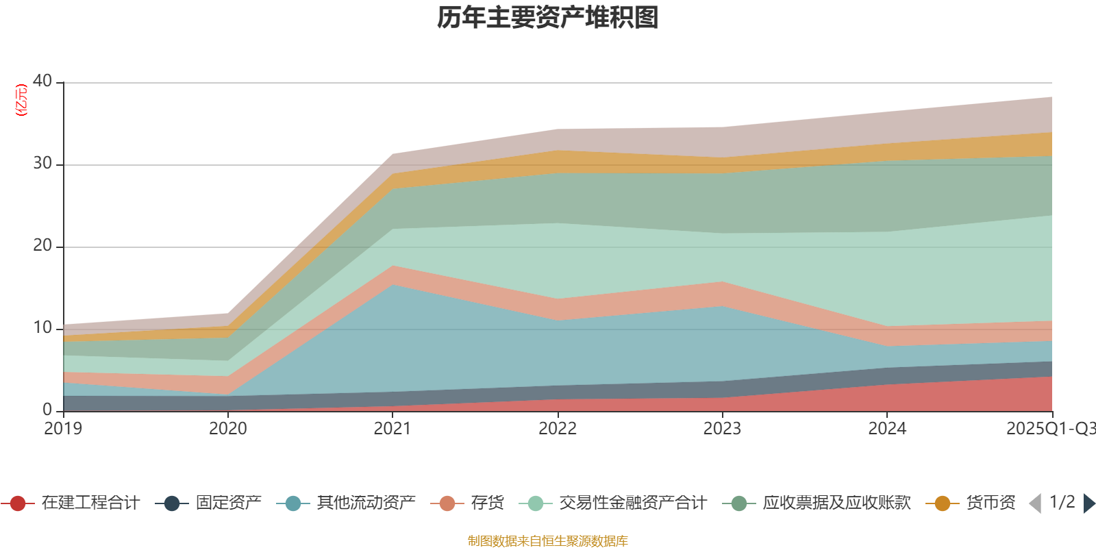 资产重大变化方面,截至2025年三季度末,公司应收票据及应收账款较上年末减少16.46%,占公司总资产比重下降4.84个百分点;在建工程合计较上年末增加30.21%,占公司总资产比重上升2.12个百分点;交易性金融资产合计较上年末增加11.61%,占公司总资产比重上升2个百分点;货币资金较上年末增加37.82%,占公司总资产比重上升1.82个百分点。
