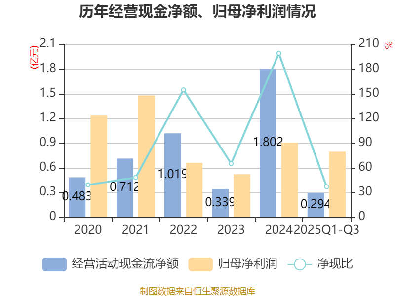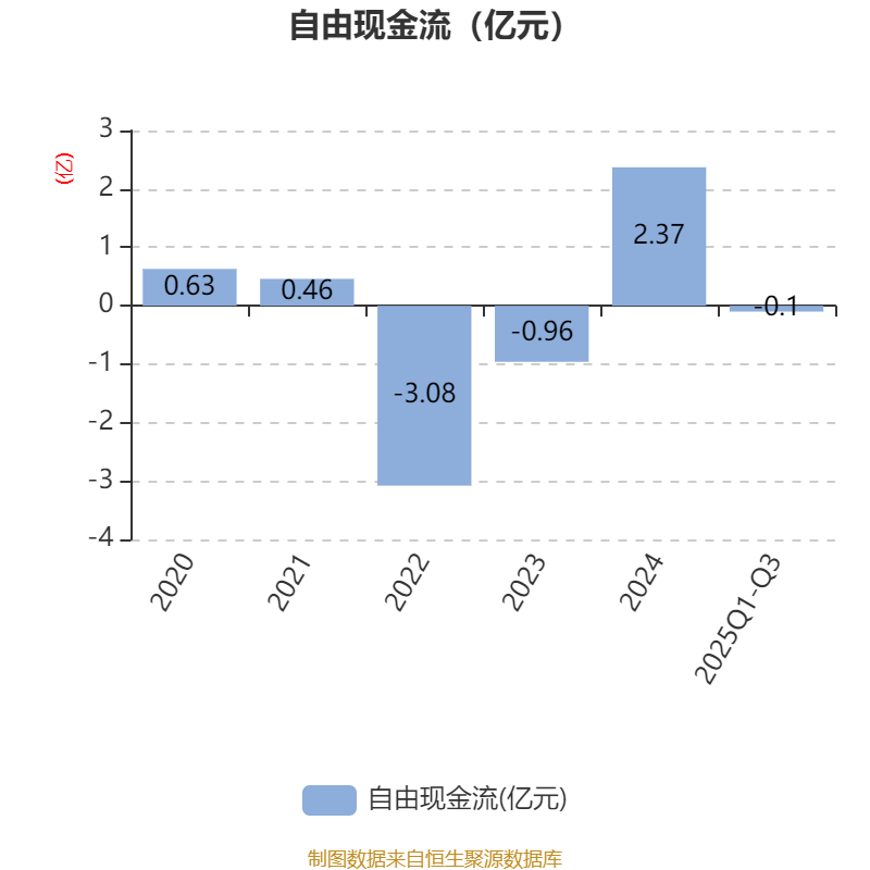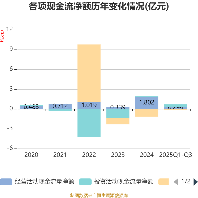 2025年前三季度,公司经营活动现金流净额为2936.89万元,同比下降79.5%;筹资活动现金流净额-1993.64万元,同比增加8922.83万元;投资活动现金流净额4047.14万元,上年同期为2.24亿元。