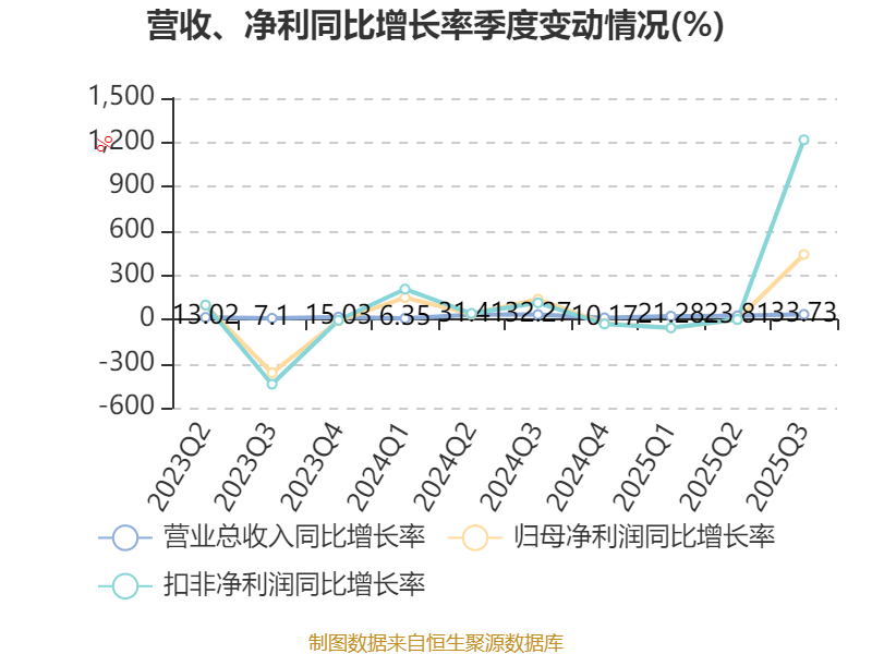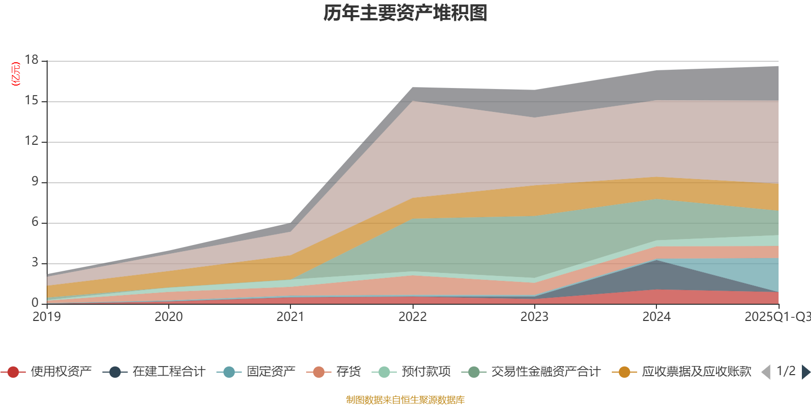 资产重大变化方面,截至2025年三季度末,公司固定资产较上年末增加2475.13%,占公司总资产比重上升13.76个百分点;在建工程合计较上年末减少100%,占公司总资产比重下降12.61个百分点;交易性金融资产合计较上年末减少41.31%,占公司总资产比重下降7.52个百分点;货币资金较上年末增加8.57%,占公司总资产比重上升2.2个百分点。