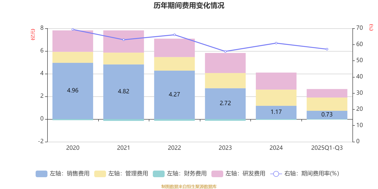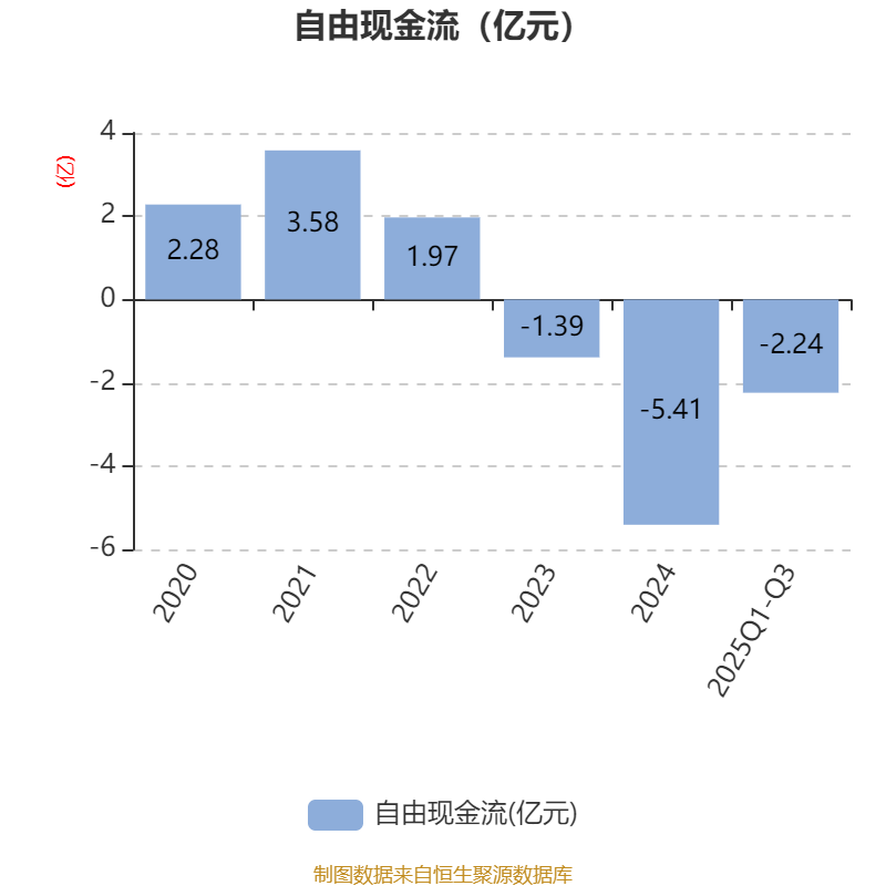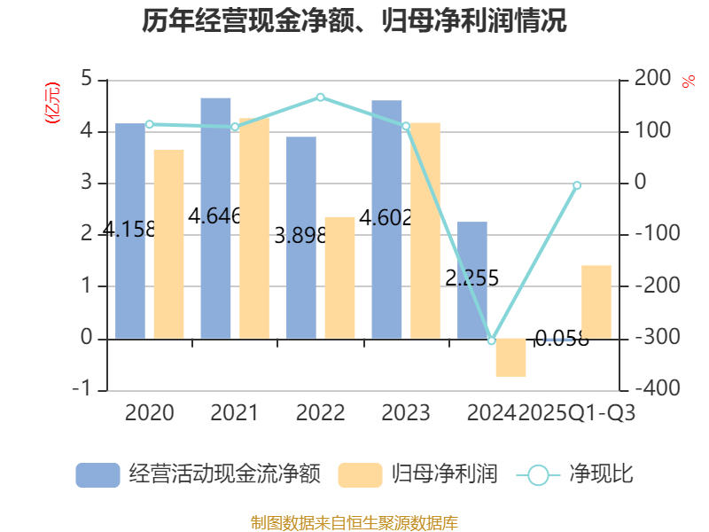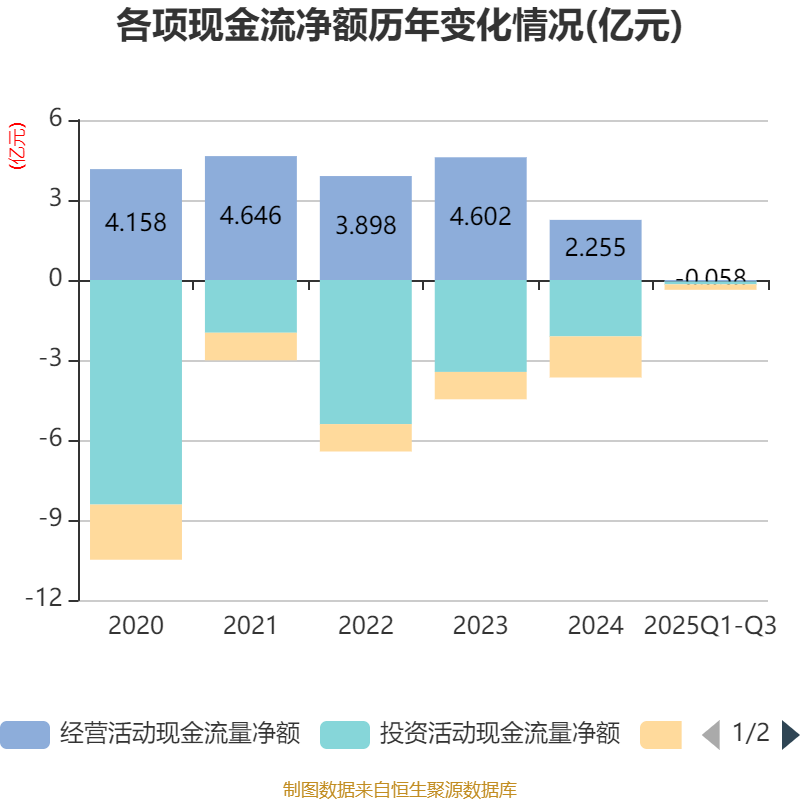 2025年前三季度,公司经营活动现金流净额为-583.17万元,同比减少1.34亿元;筹资活动现金流净额-2054.7万元,同比增加1.34亿元;投资活动现金流净额-1047.22万元,上年同期为-9022.17万元。