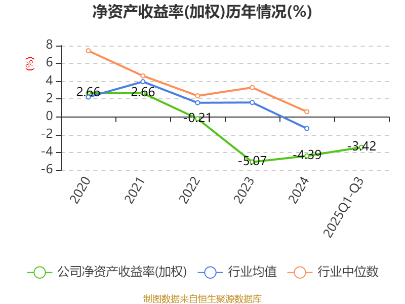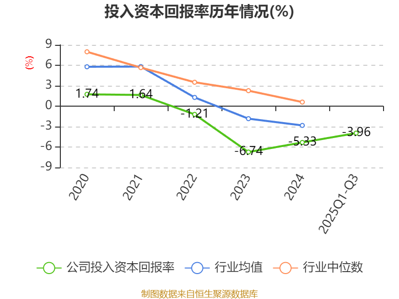 盈利能力方面, 2025年前三季度公司加权平均净资产收益率为-3.42%,同比下降2.35个百分点。公司2025年前三季度投入资本回报率为-3.96%,较上年同期下降2.53个百分点。