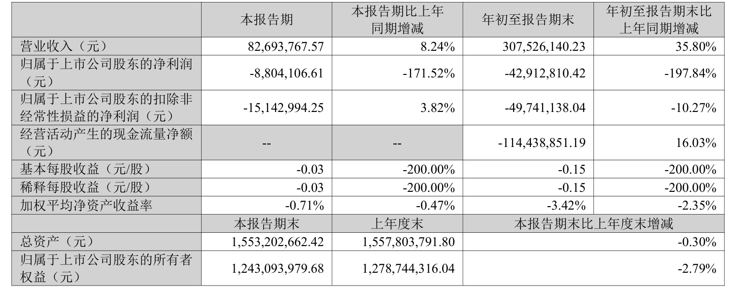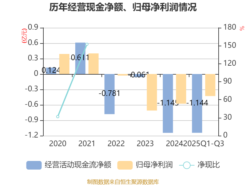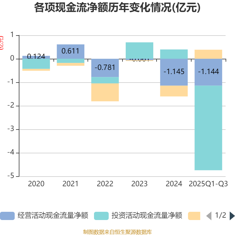 2025年前三季度,公司经营活动现金流净额为-1.14亿元,同比增加2184.82万元;筹资活动现金流净额3841.55万元,同比增加8373.38万元;投资活动现金流净额-3.6亿元,上年同期为-3.02亿元。