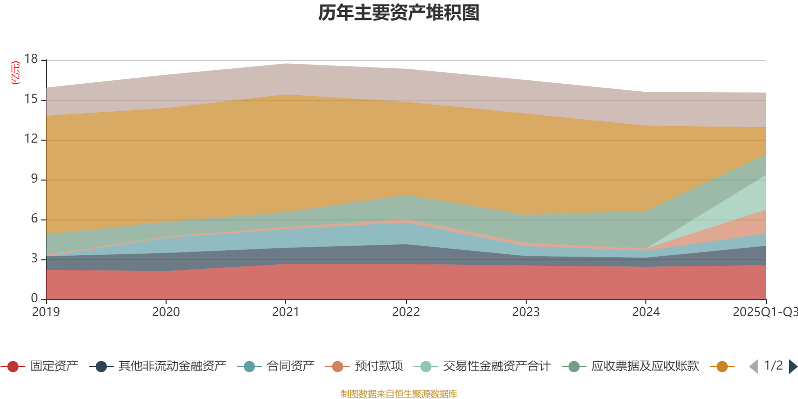 资产重大变化方面,截至2025年三季度末,公司货币资金较上年末减少68.19%,占公司总资产比重下降28.03个百分点;交易性金融资产合计占公司总资产的16.8%,上年末为0;预付款项较上年末增加1061.3%,占公司总资产比重上升10.66个百分点;应收票据及应收账款较上年末减少45.14%,占公司总资产比重下降8.15个百分点。