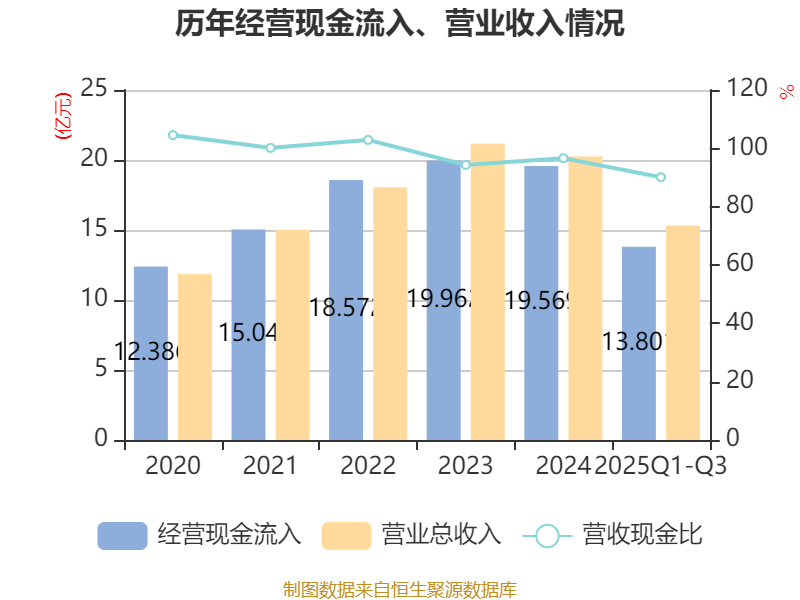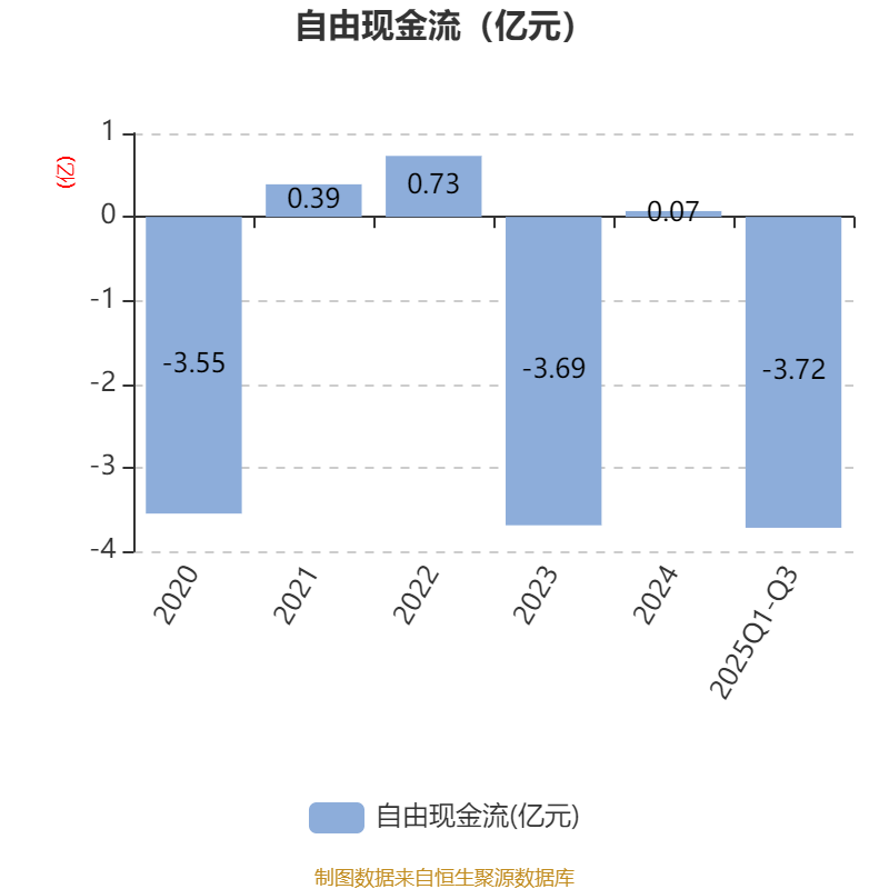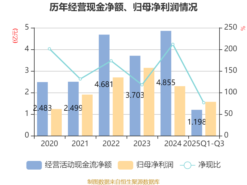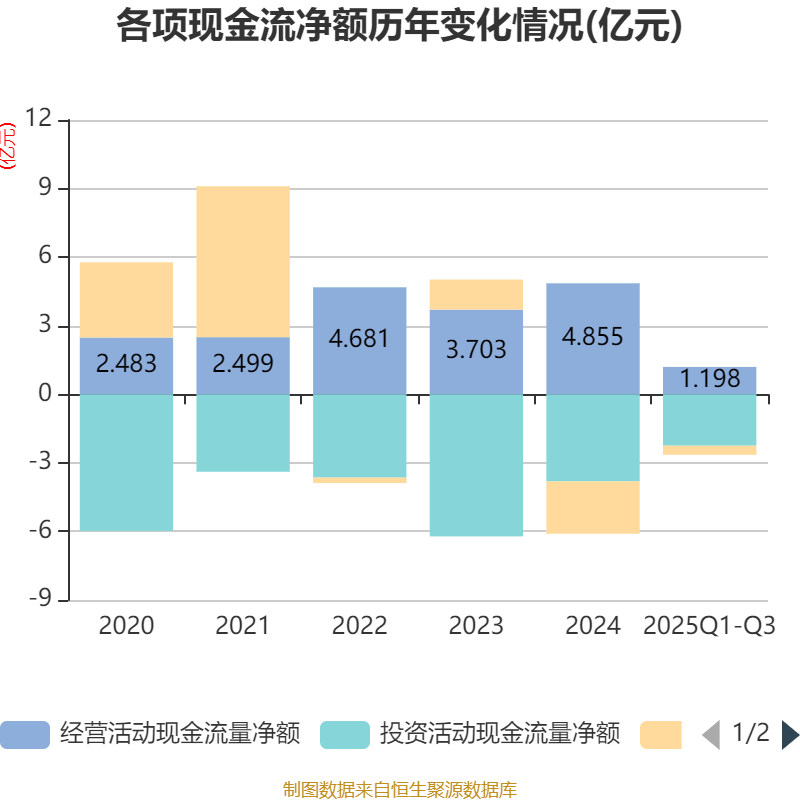 2025年前三季度,公司经营活动现金流净额为1.2亿元,同比下降24.71%;筹资活动现金流净额-4004.11万元,同比增加2912.51万元;投资活动现金流净额-2.25亿元,上年同期为-3.12亿元。
