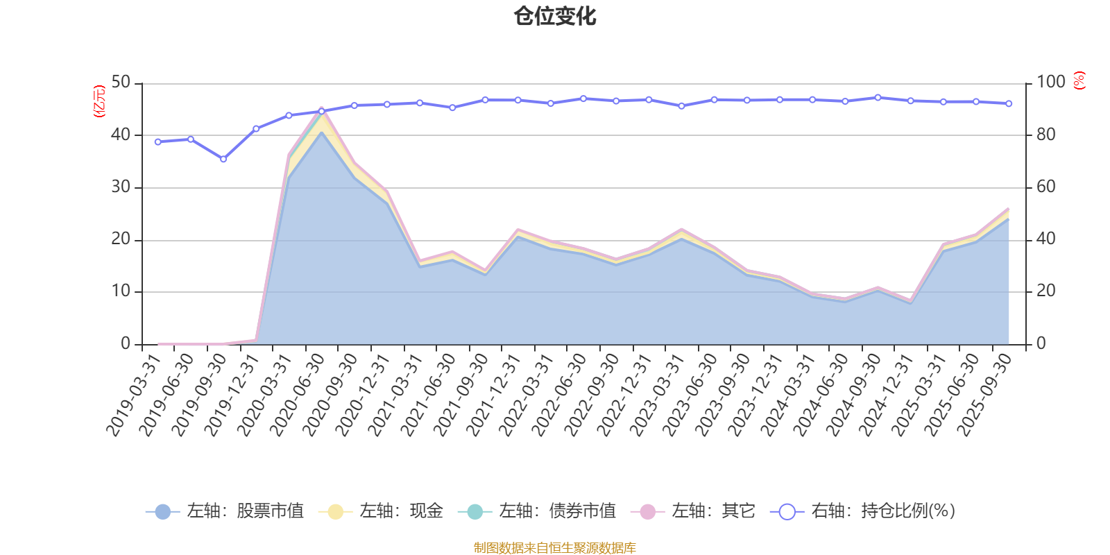据定期报告数据统计,近三年平均股票仓位为93.22%,同类平均为86.72%。2024年三季度末基金达到94.55%的最高仓位,2019年三季度末最低,为70.97%。