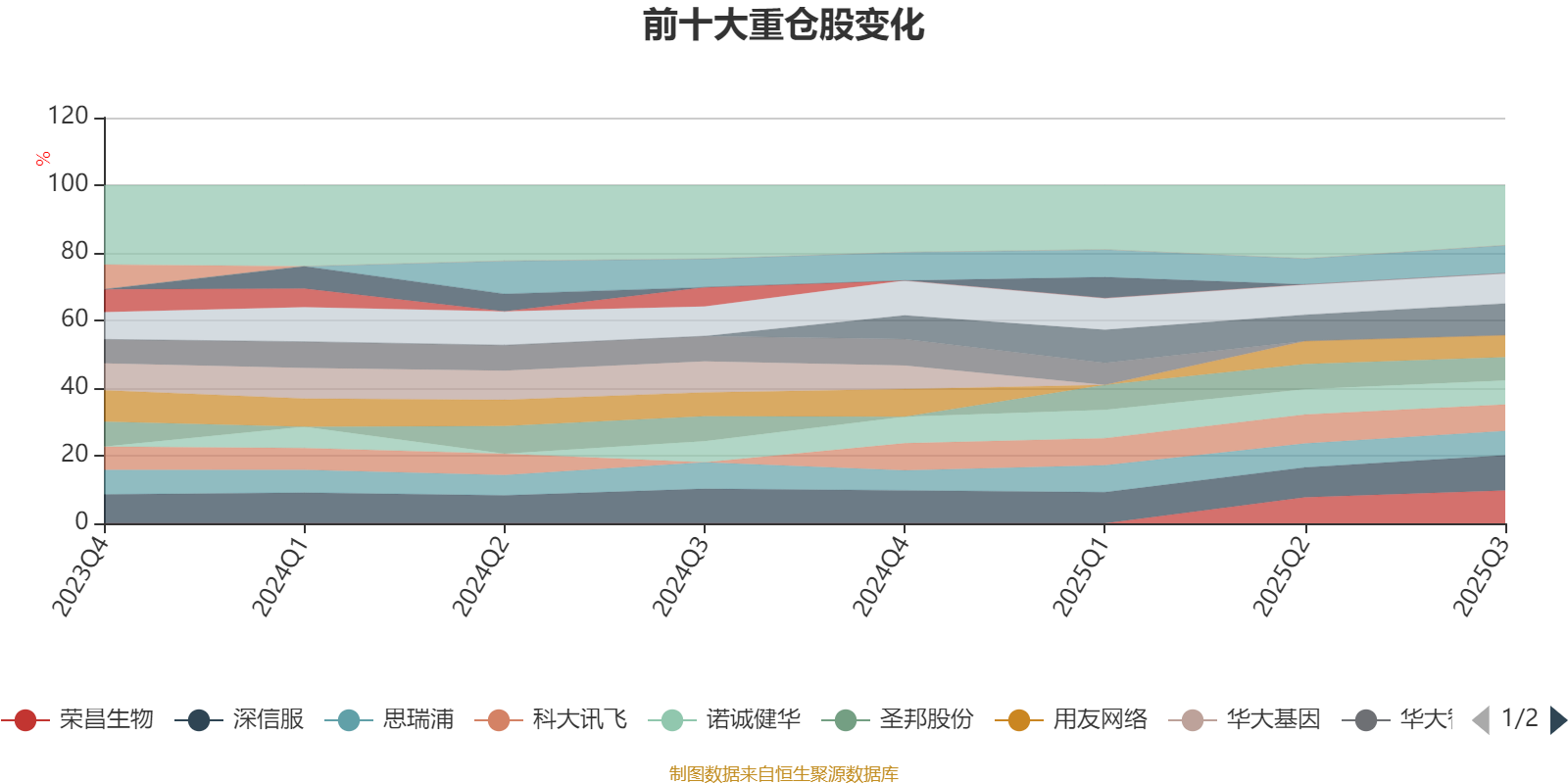 该基金持股集中度较高,近2年前十大重仓股集中度长期超过60%。截至2025年三季度末,基金十大重仓股分别是深信服、荣昌生物、瑞芯微、百济神州、寒武纪、科大讯飞、思瑞浦、诺诚健华、圣邦股份、用友网络。