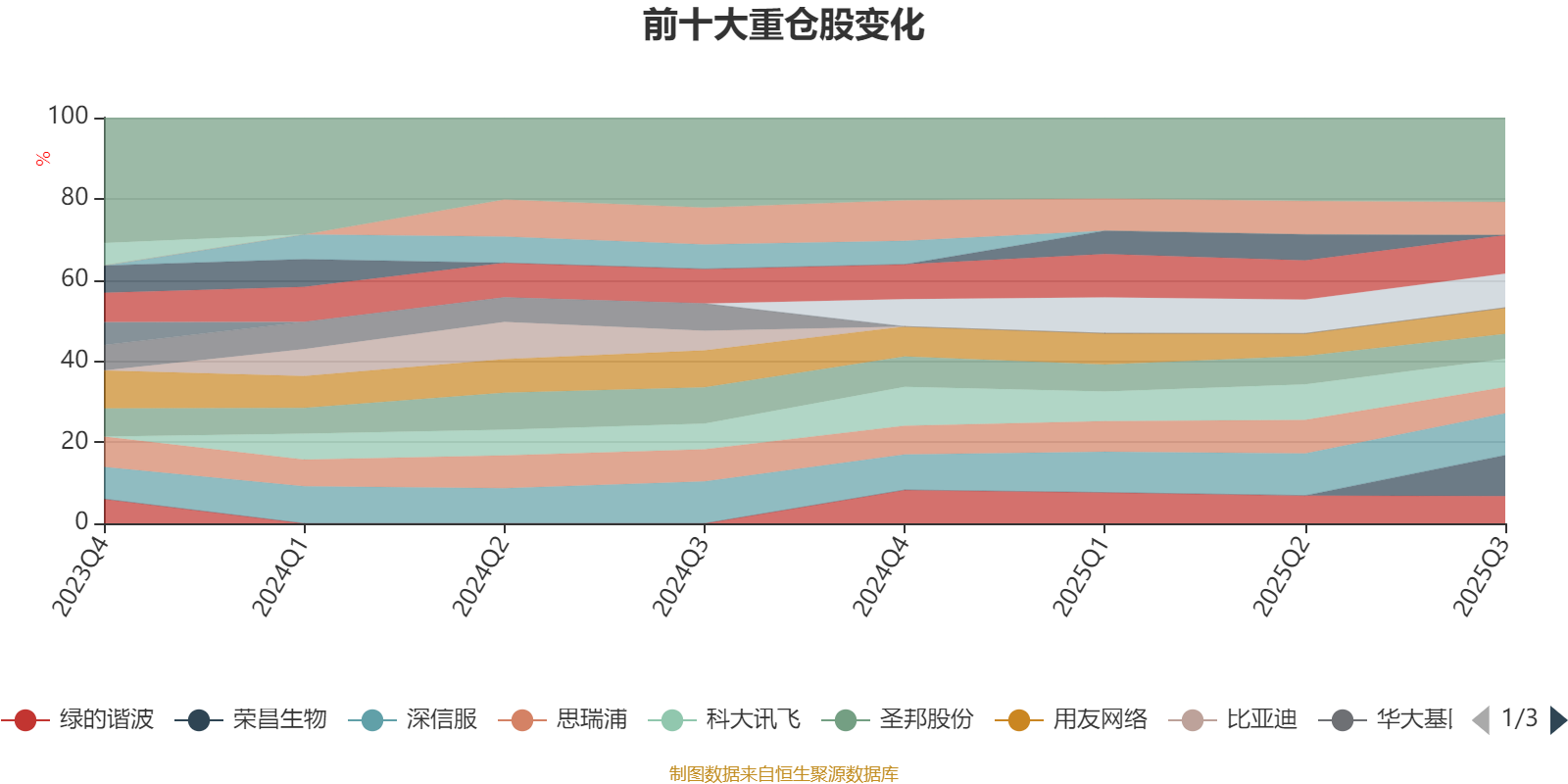 该基金持股集中度较高,近2年前十大重仓股集中度长期超过60%。截至2025年三季度末,基金十大重仓股分别是深信服、荣昌生物、百济神州、瑞芯微、寒武纪、科大讯飞、绿的谐波、用友网络、思瑞浦、圣邦股份。