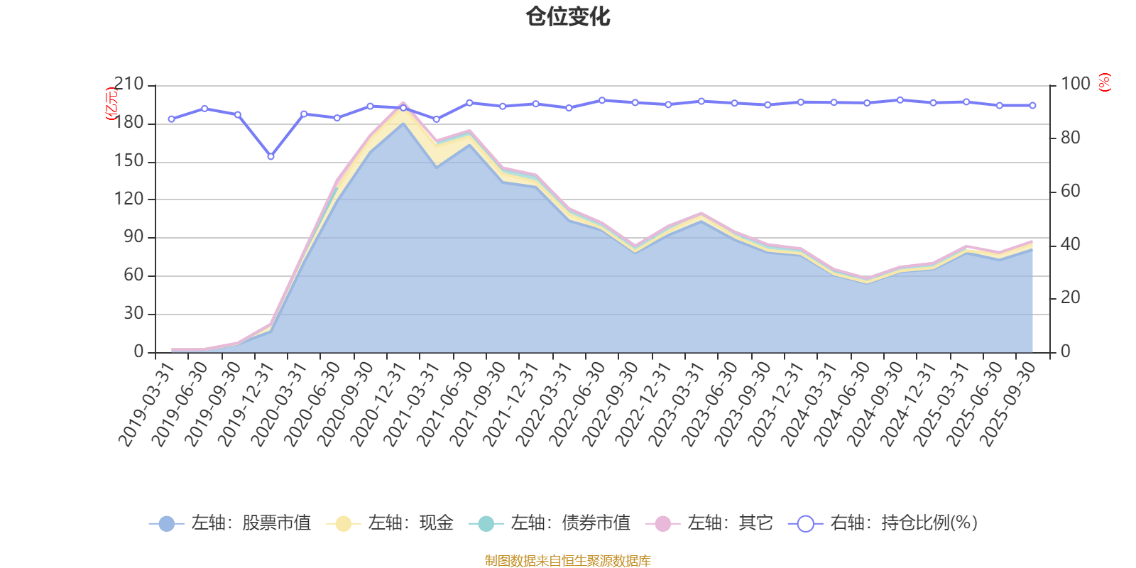 据定期报告数据统计,近三年平均股票仓位为93.32%,同类平均为86.72%。2024年三季度末基金达到94.47%的最高仓位,2019年末最低,为73.35%。